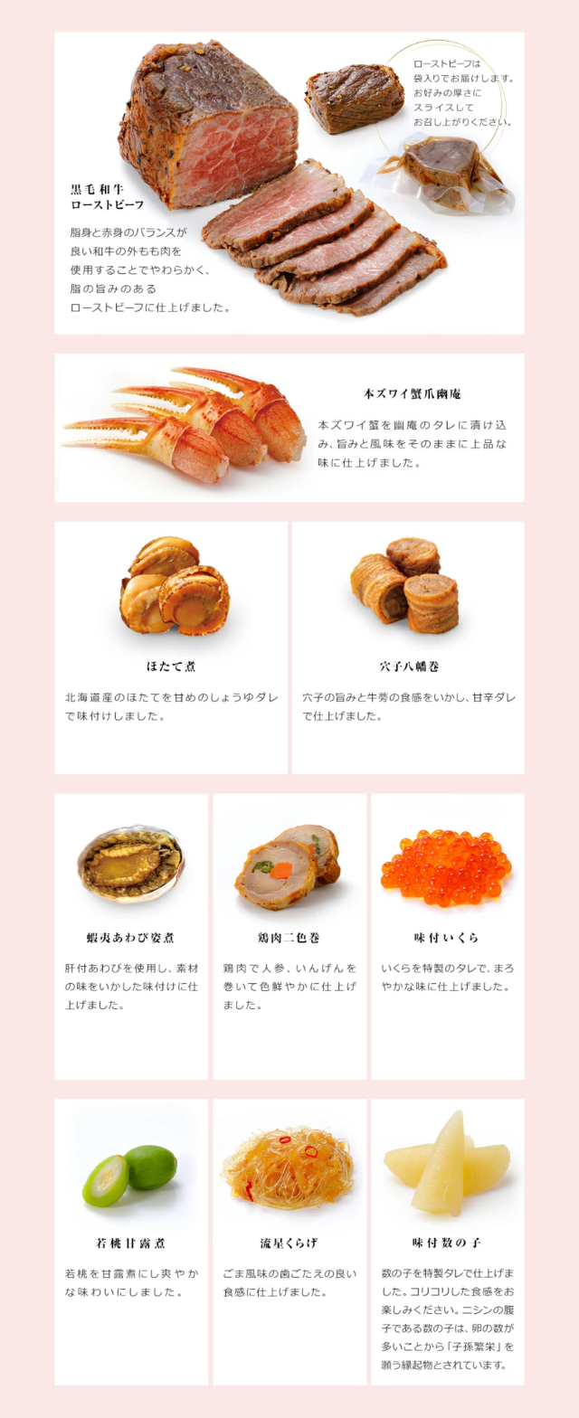 | 調理方法 | お重を開いて、テーブルに並べればそのままお召し上がりいただけます。 ※ローストビーフは袋入りでお届けします。お好みの厚さにスライスしてお召し上がりください。 |