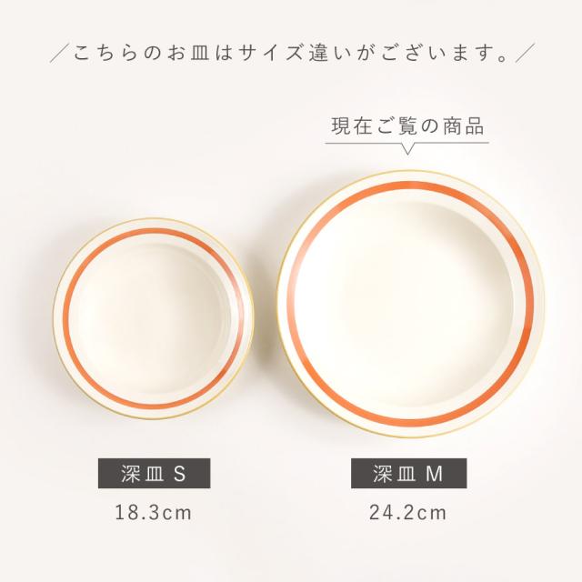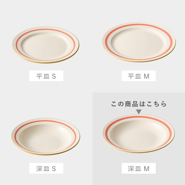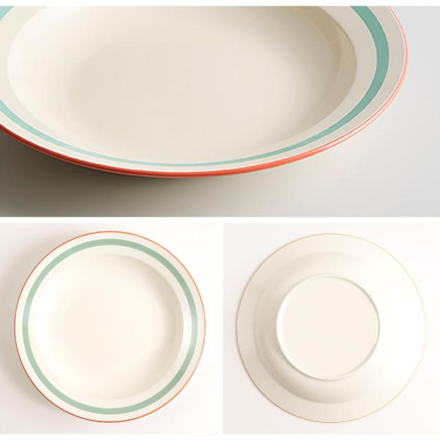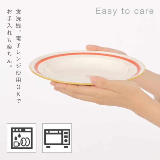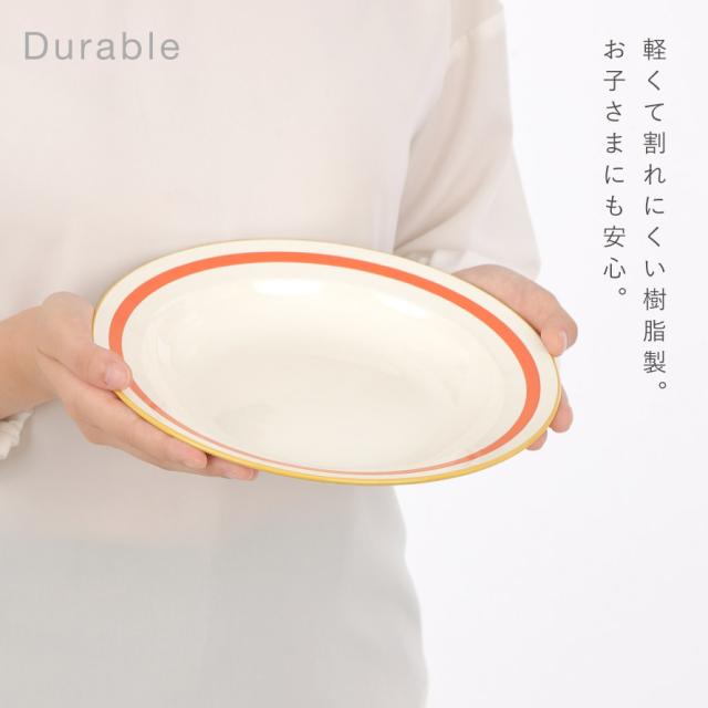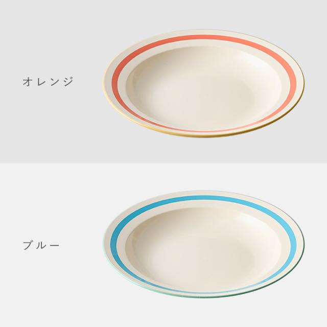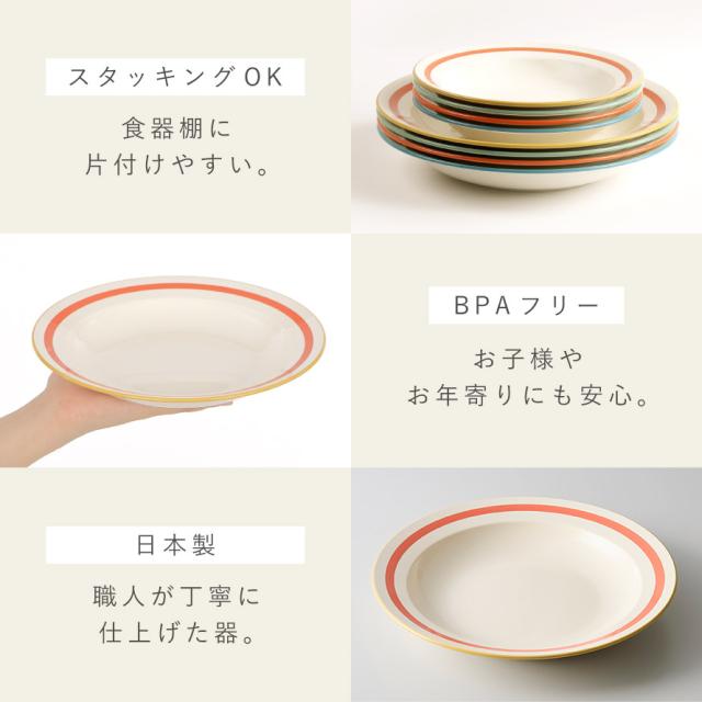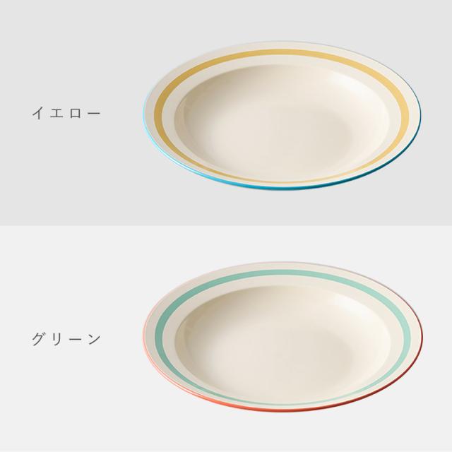 お皿の縁のラインがアクセント。少しレトロ感のあるデザインは食卓を楽しく彩ります。家庭用はもちろん、カフェ、アウトドア、お子様用に使っても。