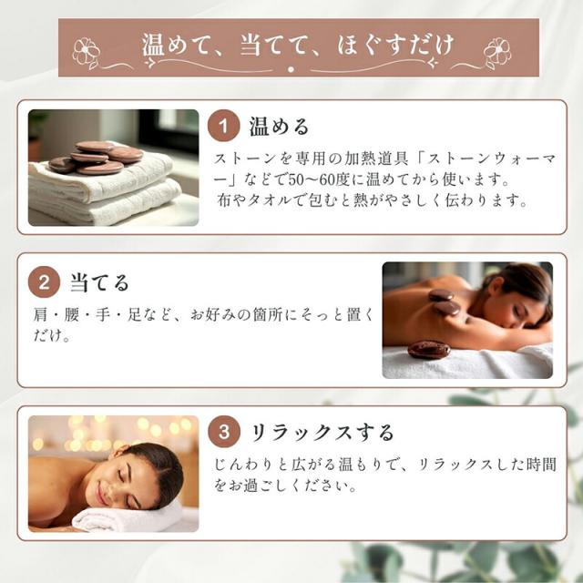 使用方法: 使い方は簡単です。専用のウォーマーなどで50〜60度に温めてから、布やタオルで包んでご使用ください。 肩、腰、足など、お好みの箇所に置くだけで、心地よいぬくもりが広がります。また、コールドストーンとして冷やして使うこともできます。