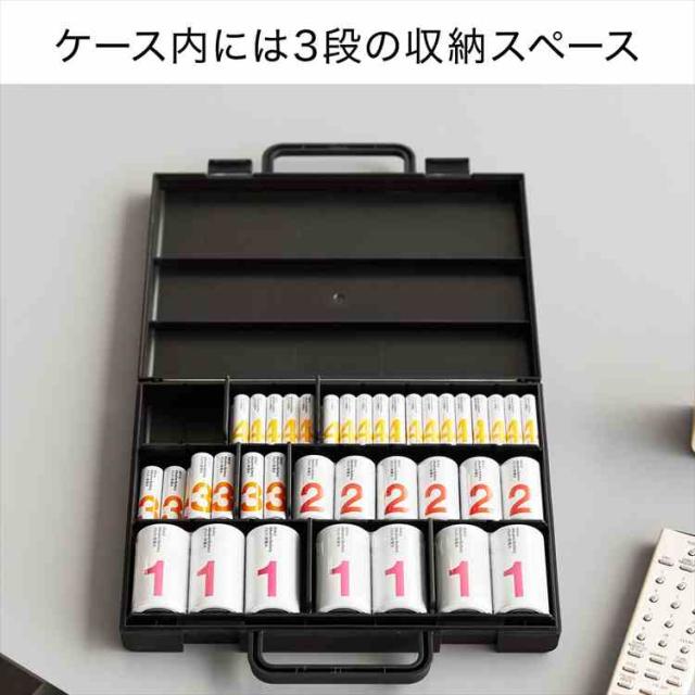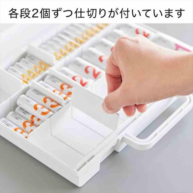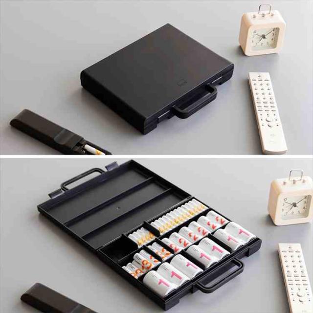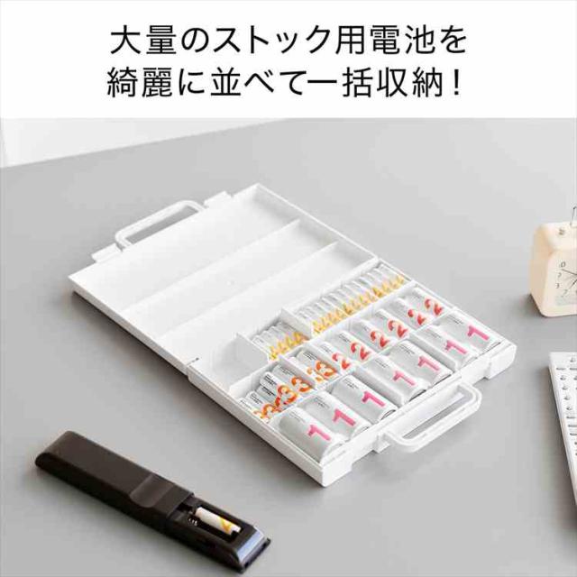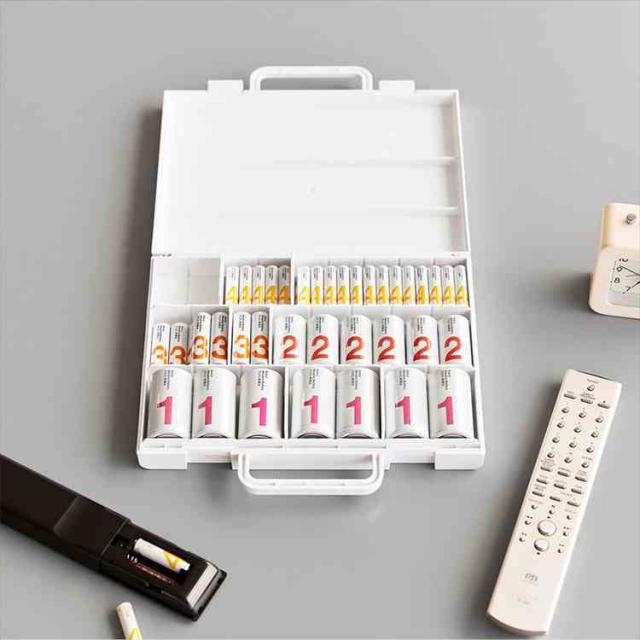 持ち運びもラクラク、分別して収納できる電池ケースです。電池の種類と数がひと目でわかるので、交換もスムーズ。A4よりコンパクトなスリムサイズで、省スペースにすっきり収納できます。防災用品としても重宝する電池をスマートに保管でき、仕切りの位置を変えれば使用済み電池の管理にも便利です。