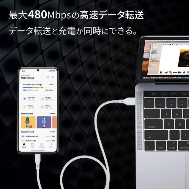 480Mbps高速データ転送にも対応し、写真・動画・音楽・書類などのデータ移動もスムーズ。ケーブルの付根強化構造と高耐久ナイロン編みにより約25,000回の折り曲げ試験をクリアした耐久仕様で断線を防止。
