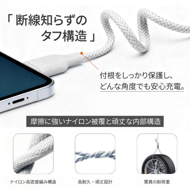 耐摩耗性に優れたナイロン編みケーブルを採用し、引っ張りや曲げにも強い高耐久仕様。