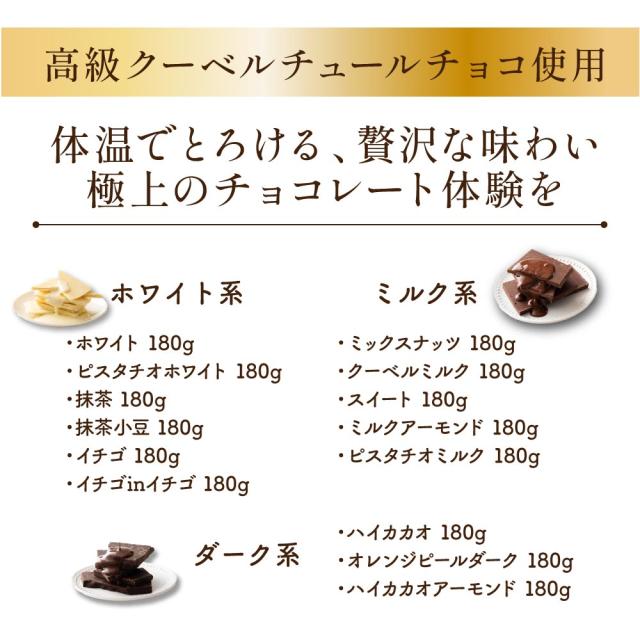 | 原材料名 | ●ハイカカオ180g カカオマス(ガーナ製造、マレーシア製造)、砂糖、ココアバター/乳化剤、香料、(一部に乳成分・大豆を含む) ●ホワイト180g ココアバター、砂糖、全乳粉、脱脂粉乳、乳化剤、香料、(一部に乳成分・大豆を含む) ●ミルク180g 砂糖、全乳粉、ココアバター、カカオマス、乳化剤、香料(一部に乳成分、大豆を含む) ●スイート180g カカオマス、砂糖、ココアバター、全粉乳/乳化剤・香料、(一部に乳成分、大豆を含む) ●ハイカカオアーモンド180g ハイカカオチョコレート(国内製造)(カカオマス、砂糖、ココアバター、全粉乳)、アーモンド/乳化剤、香料、(一部に大豆・乳成分・アーモンドを含む) ●ミックスナッツチョコ180g ハイカカオチョコレート(国内製造)(カカオマス、砂糖、ココアバター)、くるみ、アーモンド、カシューナッツ、マカダミアナッツ/乳化剤、(一部に乳成分・くるみ・大豆・アーモンド・カシューナッツを含む) ●ピスタチオホワイト180g チョコレート(ココアバター、砂糖、全乳粉、脱脂粉乳)(日本製造)、ピスタチオ/乳化剤、香料、(一部に乳成分・大豆を含む) ●ピスタチオミルク180g 砂糖、カカオマス、ココアバター、ピスタチオ、全粉乳/乳化剤(大豆由来)、香料、(一部に乳成分・大豆を含む) ●オレンジピール180g カカオマス(マレーシア製造)、砂糖、オレンジピール、ココアバター、全粉乳、ブドウ糖果糖液糖/乳化剤、香料、酸味料(クエン酸)、漂白剤(亜流酸塩)、(一部に乳成分・大豆・オレンジを含む) ●抹茶180g ココアバター、砂糖、全乳粉、脱脂粉乳、植物油脂、バターミルクパウダー、抹茶/乳化剤、香料、(一部に乳成分・大豆を含む) ●抹茶小豆180g ココアバター、砂糖、小豆、全乳粉、脱脂粉乳、植物油脂、バターミルクパウダー、抹茶/乳化剤、香料(一部に乳成分・大豆を含む) ●いちご180g ココアバター、砂糖、全乳粉、脱脂粉乳、植物油脂、いちごパウダー、乳糖/乳化剤、香料、紅麹色素、酸化防止剤、(一部に乳成分・大豆を含む) ●イチゴinイチゴ180g ココアバター、砂糖、全乳粉、いちご、いちごパウダー、脱脂粉乳、植物油脂、乳糖/乳化剤、酸味料、紅麹色素、香料、酸化防止剤、着色料、(一部に乳成分・大豆を含む) ●ミルクアーモンド180g 砂糖、全乳粉、ココアバター、アーモンド、カカオマス/乳化剤、香料、(一部に乳成分・大豆・アーモンドを含む) |