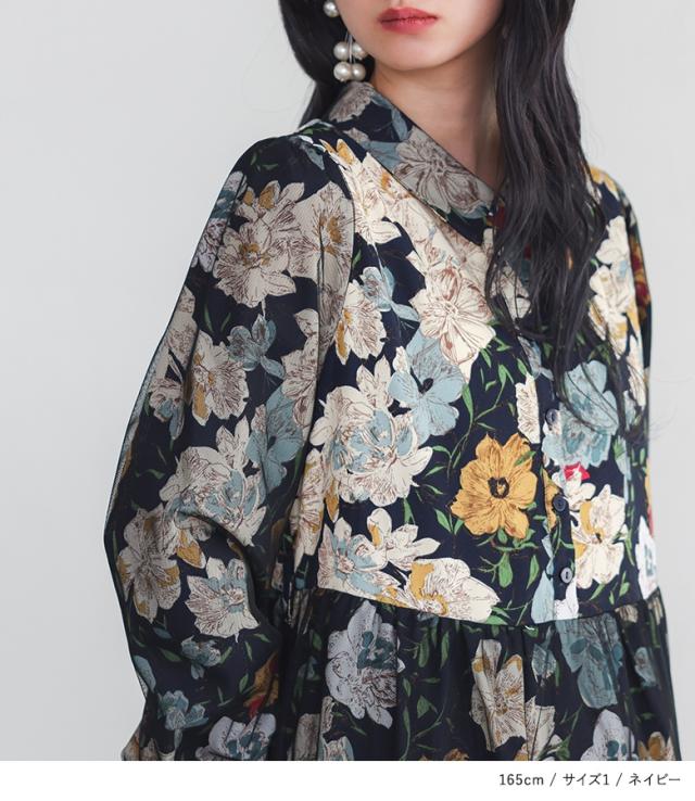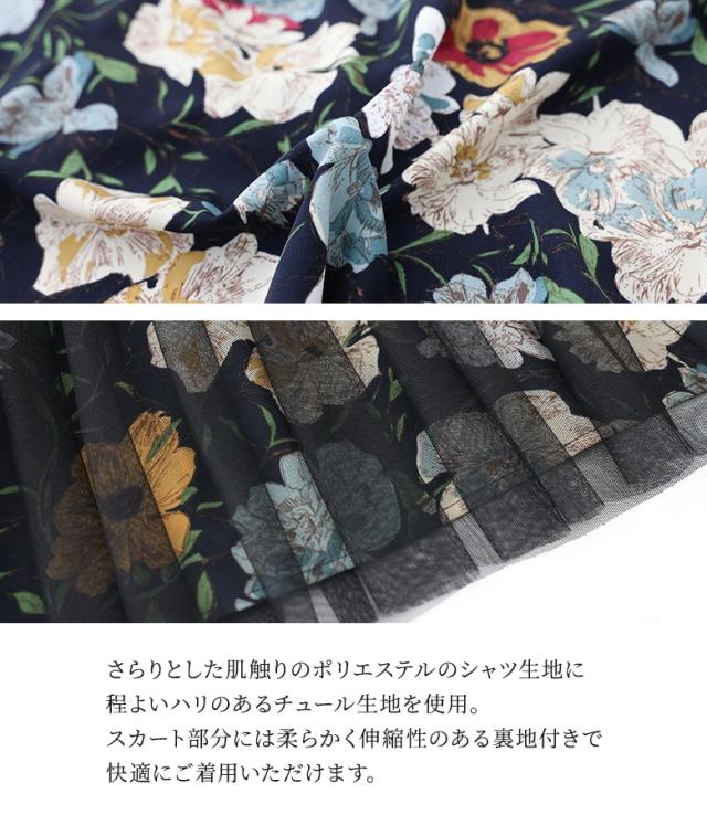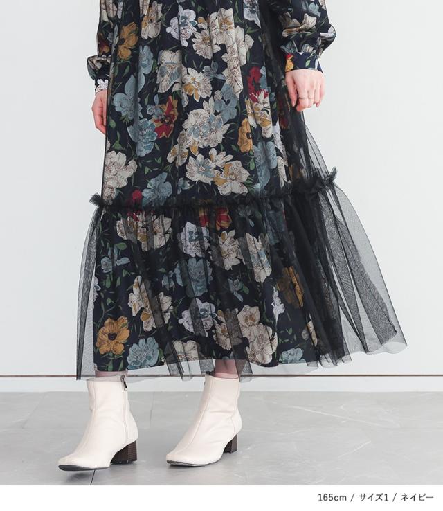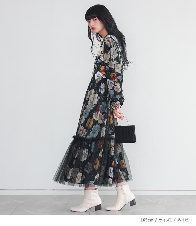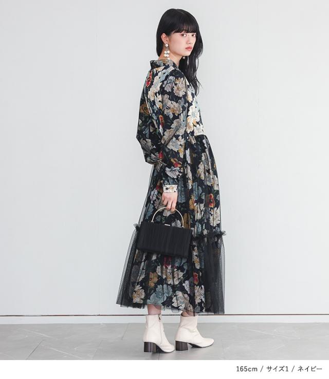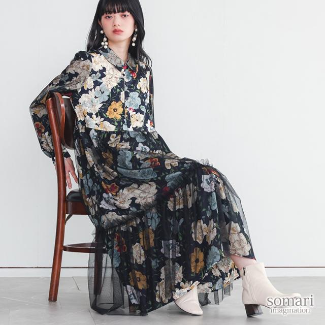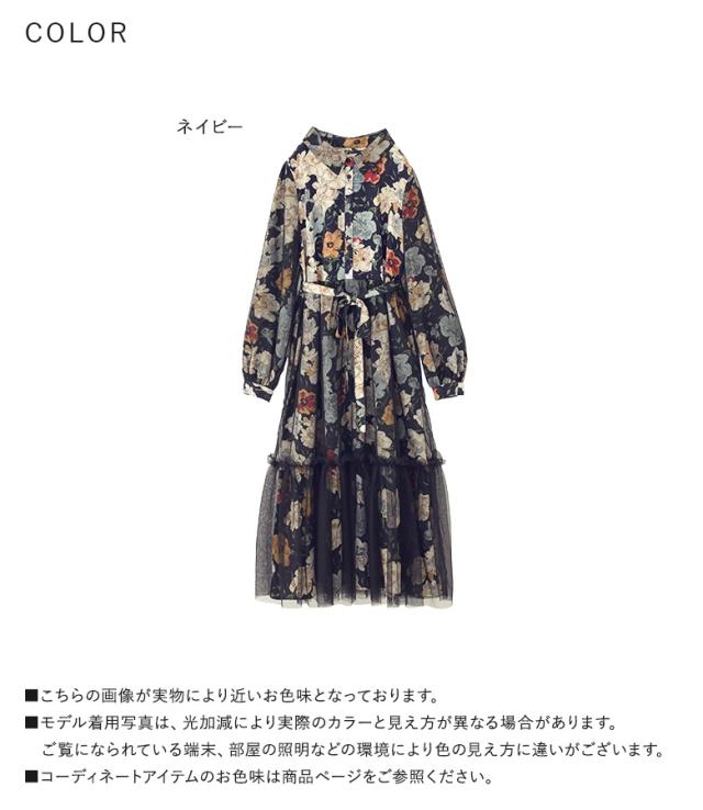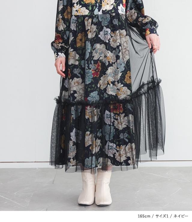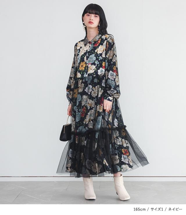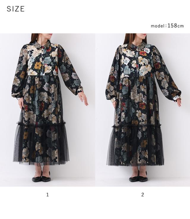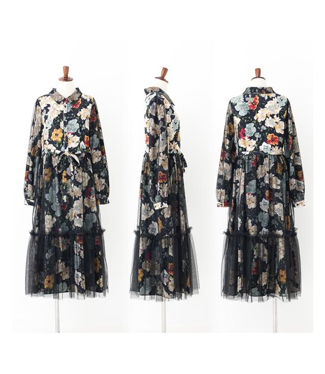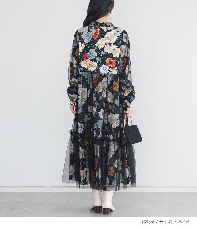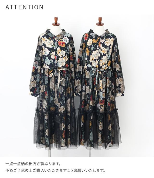 <冬新作>『花柄チュールドッキングワンピース』【メール便不可】【30】[ワンピース 長袖 レディース ドレス ロング丈 花柄 チュール ドッキング シャツワンピース ベルト付き 秋 冬]