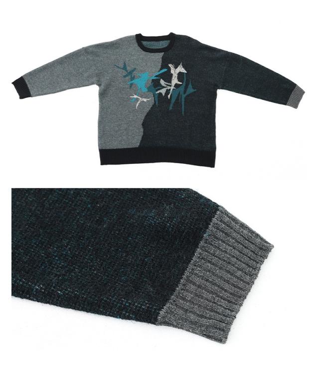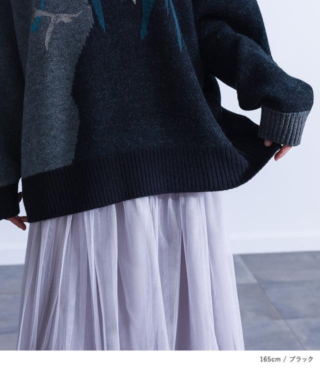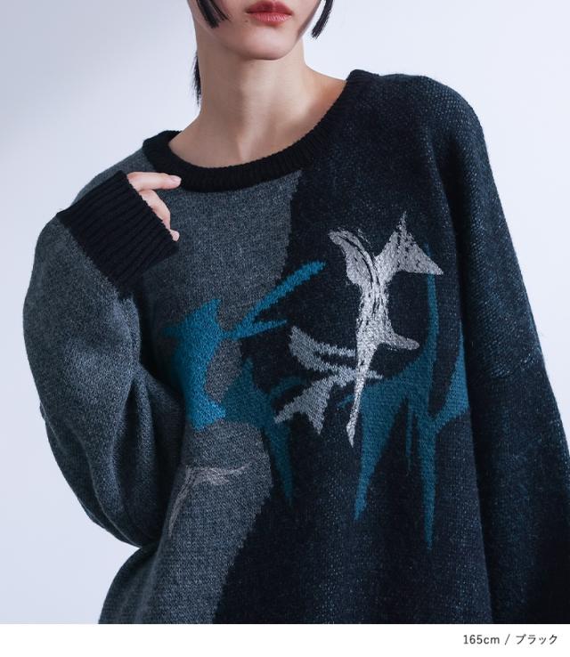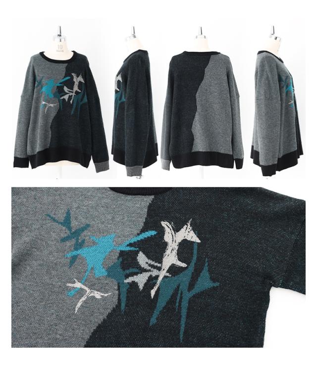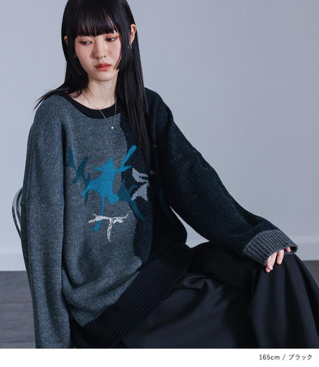<冬新作>『配色箔プリントアート柄ニット』【メール便不可】【20】[ニット 長袖 レディース トップス セーター アート柄 配色 アシンメトリー ジャガード ジャカード 箔プリント 体型カバー 秋 冬]