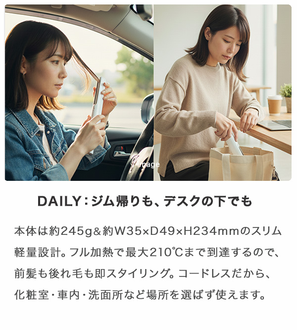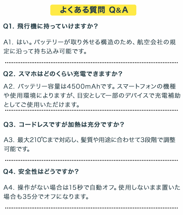 【バッテリーを外せば、自由になれる】 バッテリー着脱式コードレスストレートアイロン ━━━━━━━━━━━━━━━━ こんな人におすすめ! ━━━━━━━━━━━━━━━━ 「旅行中も髪はちゃんと整えたい、けど荷物が増えるのは嫌」 「コードレスは便利だけど、飛行機で持ち運べるか不安」 「モバイルバッテリーを別で持ち歩くのが面倒」 コードに縛られないって言っても、結局バッテリー問題で縛られてませんか? このアイロンなら、取り外せるバッテリーで旅も日常も身軽に。 1台で「スタイリング+スマホ充電」が叶い、飛行機にも安心対応。 スマートに整えたい、そんな人のための新しい選択肢です。 ━━━━━━━━━━━━━━━━ \これ1本で叶う3つの自由/ ━━━━━━━━━━━━━━━━ ■ TRAVEL:旅行スタイル、もっと身軽に リチウムイオンバッテリーは取り外し式で4500mAh。 バッテリー単体でモバイルバッテリーとしても使えるから、 別でバッテリーを持つ必要がなくなります。 さらに、航空機に乗る際も、着脱式だからスマートに対応可能。 旅に必要な整う力と充電力を、これ1台に。 ■ DAILY:ジム帰りも、デスクの下でも 本体は約245g&約W35×D49×H234mmのスリム軽量設計。 フル加熱で最大210℃まで到達するので、前髪も後れ毛も即スタイリング。 コードレスだから、化粧室・車内・洗面所など場所を選ばず使えます。 ■ SAFETY:「うっかり」も「不安」も自動でオフ 15秒間操作がなければ自動で電源オフ。 さらに35分間未使用で完全停止のW安全設計。 「出かけた後に不安になる」そんな毎日を、安心に変えます。 ━━━━━━━━━━━━━━━━ 注目ポイント ━━━━━━━━━━━━━━━━ ■ バッテリー取り外し式で飛行機移動にも対応 ■ スマホも充電できるモバイルバッテリー機能搭載 ■ 温度は3段階(160℃/185℃/210℃)から選べる ■ コードレス&コンパクトでどこでも使える ■ シリコンキャップ付属で携帯・収納も安心 ━━━━━━━━━━━━━━━━ デザインの魅力:スリム&軽量で持ち運び自由 ━━━━━━━━━━━━━━━━ 旅行や出張用にアイロンと充電器を2つ持っていく、そんな常識を変えるデザイン。 手にフィットするコンパクトサイズながら、最大40分の連続使用に対応。 Type-Cケーブル対応で汎用性も抜群。 白と黒の2カラー展開で、旅先でも私らしさを演出。 ━━━━━━━━━━━━━━━━ スタッフVoice(社内モニター/30代女性) ━━━━━━━━━━━━━━━━ 社内での試用時、「スマホ充電もできる」という点に驚きました。 荷物が1つ減るだけで、旅行のストレスがこんなに軽くなるとは。 唯一気になるのは、使用時間(最大40分)の把握が必要なこと。 でもちょっとだけ直したい時には十分です。 ※本コメントは社内モニターの体験に基づいた個人的な感想です。 ━━━━━━━━━━━━━━━━ ご購入前の確認事項 ━━━━━━━━━━━━━━━━ ? 濡れた髪への使用は避けてください ? バッテリーは着脱式ですが、航空会社ごとの規定をご確認ください ? バッテリー容量により、使用時間は25〜40分程度です ? 急速充電を行うには5V/2Aのアダプターをご使用ください ━━━━━━━━━━━━━━━━ 最後にひとこと ━━━━━━━━━━━━━━━━ 「コンパクトでコードレス」はもう普通。 取り外せて、スマホも充電できるという一歩先の便利を手に入れませんか? 旅の荷物が1つ減るだけで、心まで軽くなる。 外出のたびに実感できる、実用性の高い1台です。 ━━━━━━━━━━━━━━━━ よくあるご質問(Q&A) ━━━━━━━━━━━━━━━━ Q. 飛行機に持っていけますか? A. はい。バッテリーが取り外せる構造のため、航空会社の規定に沿って持ち込み可能です。 Q. スマホはどのくらい充電できますか? A. バッテリー容量は4500mAhです。スマートフォンの機種や使用環境によりますが、目安として一部のデバイスで充電補助としてご使用いただけます。 Q. コードレスですが加熱は充分ですか? A. 最大210℃まで対応し、髪質や用途に合わせて3段階で調整可能です。 Q. 安全性はどうですか? A. 操作がない場合は15秒で自動オフ。使用しないまま置いた場合も35分でオフになります。 ━━━━━━━━━━━━━━━━ 📋 製品スペック ━━━━━━━━━━━━━━━━ 📏 サイズ:約W35×D49×H234mm ?? 重量:約245g 🛠 主材質:PC、PA66 🔋 バッテリー:リチウムイオン電池(4500mAh) ? 充電時間:約2.5時間(5V/2A) 🔥 設定温度:160℃/185℃/210℃(3段階) 🔁 使用時間:約25〜40分(温度により異なる) ? 消費電力:約30W(5V/2A) 🧠 安全機能:操作なし15秒オフ、非使用35分オフ 📦 付属品:シリコンキャップ、専用USBケーブル(Type-C)、説明書・保証書 🕐 保証期間:1年 🎨 カラー:ブラック/ホワイト 🌏 原産国:中国 |