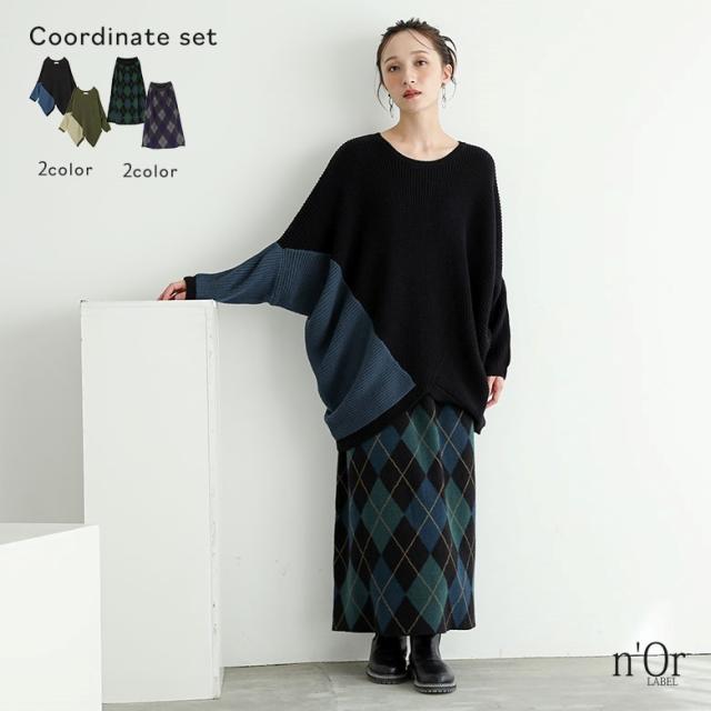 【送料無料】『変形ドルマン配色ニット×アーガイルニットスカートコーデ2点SET』【メール便不可】【50】[2点コーデセット 2025 レディース ニット トップス セーター ニットスカート ロング ボトムス スカート]