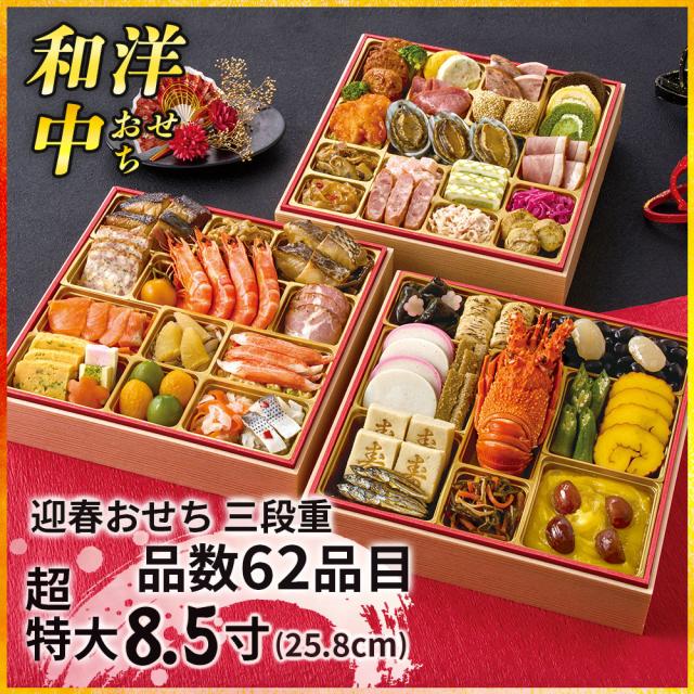 | 内容量 | 三段重お重サイズ(外寸):縦258mm×横258mm×高さ177mm(内寸(1段):39mm)(62品目)(約3〜4人前) 【一の重】昆布旨煮×3、梅型百合根羊羹×2、焼き湯葉巻×4、黒豆煮60g、白花豆煮×2、紅蒲鉾×2、白蒲鉾×2、たたきごぼう×7、ロブスター、オクラの浅漬×5、伊達巻×4、寿高野豆腐×4、田作り煮10g、きんとん100g、渋皮栗甘露煮×4、松前漬40g 【二の重】ぶり照焼×4、はすの芽(梅酢風味)3g、くるみ甘露煮30g、わかめ煮30g、真鯛幽庵焼×4、ミートローフ×3、葉付金柑甘露煮、有頭海老×4、ローストポーク×3、キャロットラペ30g、スモークサーモントラウト×4、ソデイカ昆布和え30g、数の子×3、大根焙煎胡麻サラダ30g、蟹風味蒲鉾土佐酢漬×3、九条葱入り玉子焼×3、博多高野(海老)、博多高野(ほうれん草)、梅型蒟蒻、若桃甘露煮×2、杏子煮×2、紅白なます30g、こはだレモン30g 【三の重】ハンバーグ×3、ブロッコリー(コンソメ風味)×2、豆乳と野菜の新丈(かぼちゃ)、豆乳と野菜の新丈、豚タン15g、ボロニアソーセージ×2、牛タン入ソーセージ×2、胡麻団子×2、ロールケーキ(チョコバナナ)、ロールケーキ(チーズ&レモン)、ロールケーキ(宇治抹茶)、ザーサイ15g、海老チリソース×2、小松菜と揚げの煮物25g、鮑旨煮×3、合鴨スモーク×4、つぶ貝時雨煮20g、中華くらげ30g、梅肉マヨサラダ25g、サラミ風ソーセージ×3、ハムとチーズソースのテリーヌ×3、海鮮サラダ25g、レッドキャベツのラペ25g、帆立香草焼×3 |