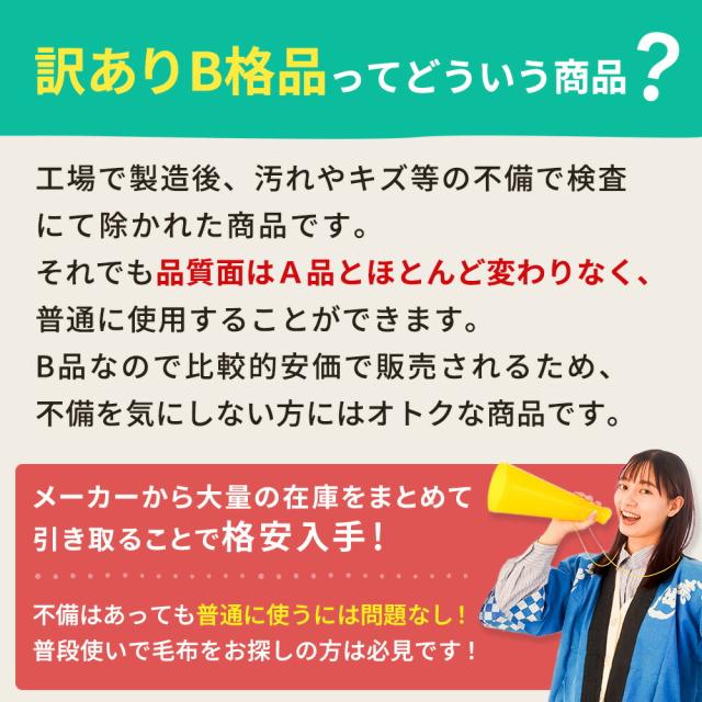 ・訳ありB格品でも品質は問題なし!おトクに購入できるチャンス 工場での検査時に汚れやキズなどで除外されたB格品ですが、品質はA品とほとんど変わらず、通常使用には問題ありません。不備を気にしない方には非常におトクな商品です。 ・お財布に優しいお買い得毛布メーカーから商品を大量仕入れし、さらに色は当店のおまかせにすることで、仕分けのコストを削減。その結果、お求めやすい価格を実現しました! ・京都の老舗メーカー「ロマンス小杉」製創業70年を超える老舗寝具メーカー「ロマンス小杉」のブランド製品で、寝心地や使い心地を追求した高品質なものづくりが魅力です。 ・ふわっふわで心地よい手触りポリエステル100%の生地があなたをふんわり包み、やわらかなふわふわの肌触りで心も体も温まります。 ・しっかりあったか2枚合わせ毛布2枚の毛布生地を重ねた構造で、空気の層が高い保温力を発揮。1枚以上のボリューム感と暖かさを実現しています。 ・衿付きで首元まであったかふっくらとした衿付き仕様で、首元や肩口の隙間をしっかりカバー。外気を防ぎ、中の暖かさを逃しません。 ・手洗いでお洗濯OK手洗い推奨ですが、自宅での洗濯が可能で、清潔に使い続けられます。 |