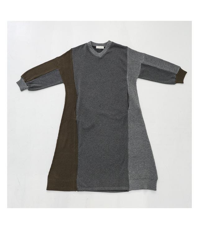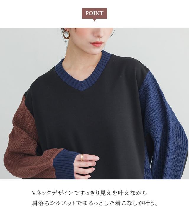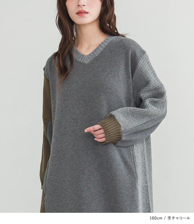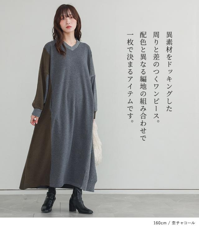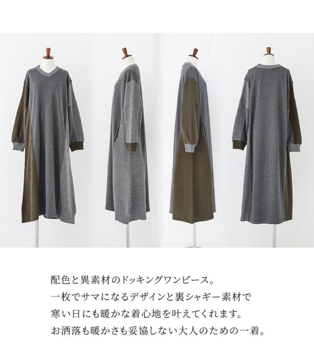 <冬新作>『裏シャギー異素材ドッキングワンピース』【メール便不可】【40】[ワンピース 裏シャギー あったか レディース ドレス 長袖 ロング丈 Vネック カットソー ニット 異素材 秋 冬]