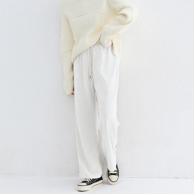 重ね着いらず、素足ですっと穿ける時短ワイドパンツ。