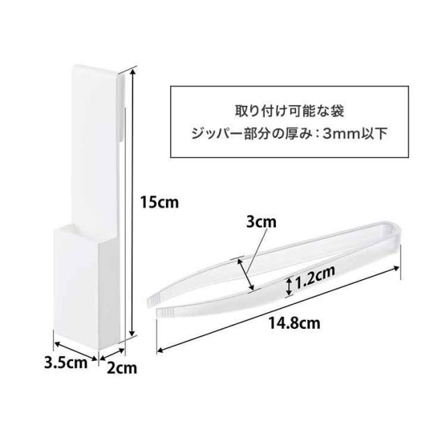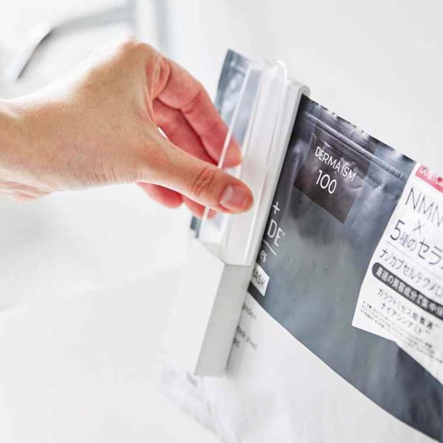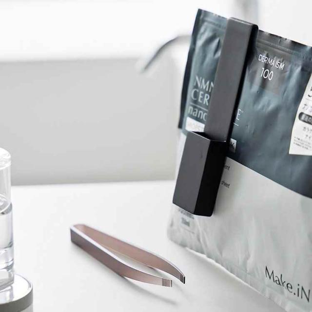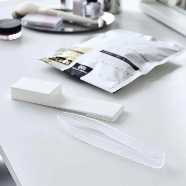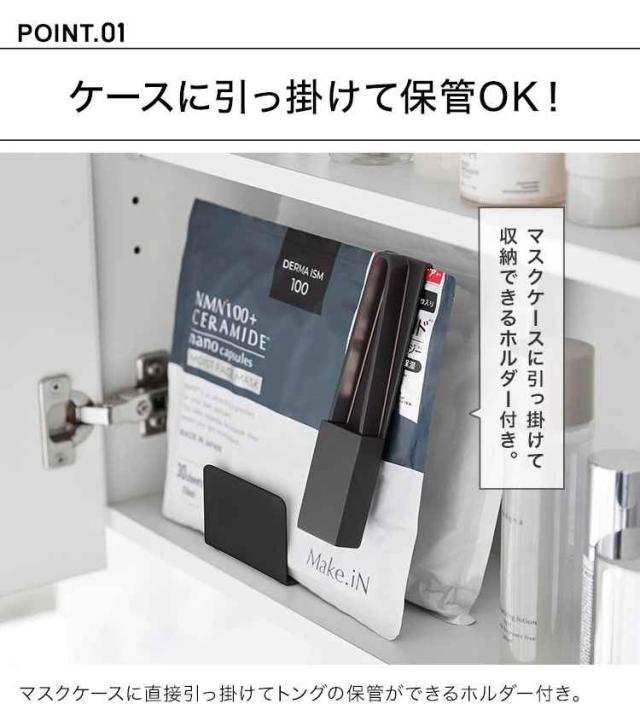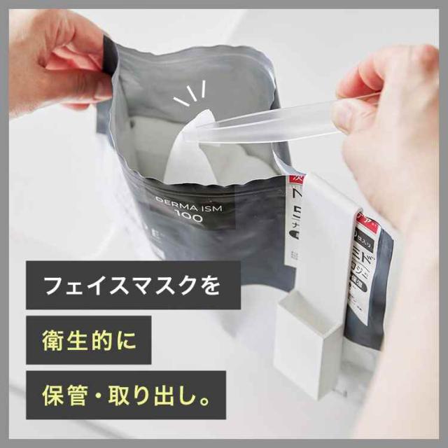 フェイスマスクを衛生的に取り出すことができるホルダー付きトング。フェイスマスクを清潔に保存することができます。使用後はジッパー部分をホルダーで摘みながら横にスライドするだけ。トングは先端が浮いた状態で置くことができ、ホルダーの底面には穴があいているので通気性も良く衛生的に使うことができます。