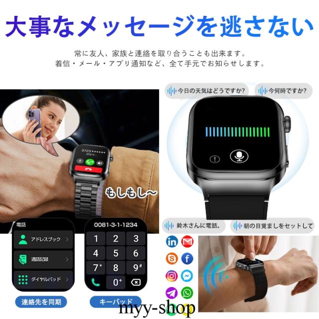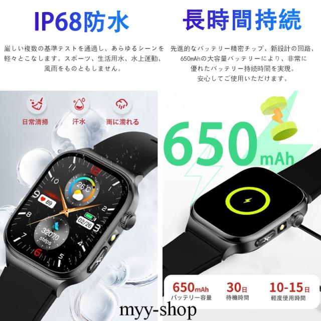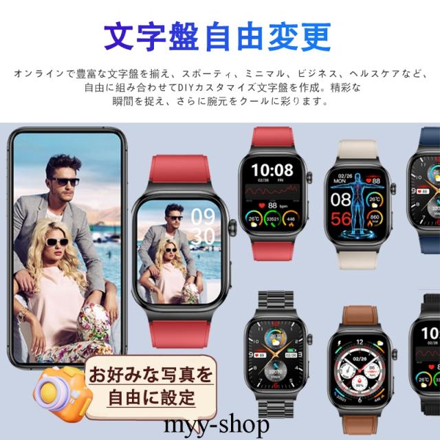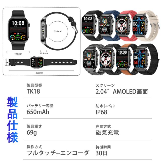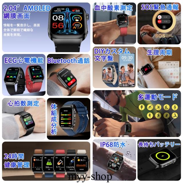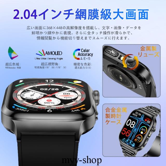 【新登場・2.04インチ大画面】スマートウォッチ従来の製品より外観、中身、性能方面より、完全バージョンアップしました!2.04インチ大画面を採用して、驚くほど鮮明で、美しくリアルな画面を実現しました。画面の明るさ調節も可能で、強い日差し下にも視認性が高く、見やいです。フルタッチパネルを採用し、老眼の方にも見やすい! 高精度な大画面で通知や文字が一目瞭然に表示される。上下左右のスライド操作で機能の切替も簡単です。専用日本語取扱説明書を各機能や操作に記載させていただき、完全なるマニュアルがあるこそ安心できます!特に初心者や年配の方におすすめ!