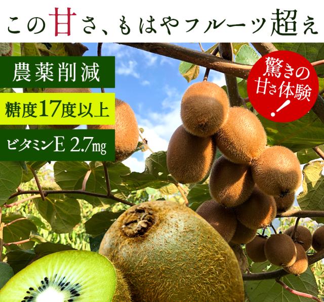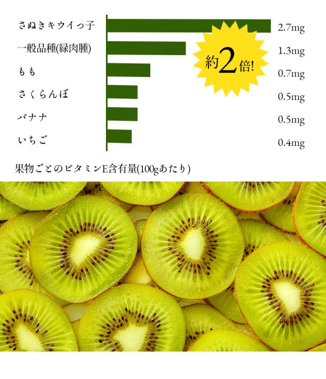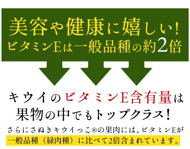 ■有機肥料にこだわり、農薬の使用を極限まで減らしました。 ■一般品種(緑肉種)に比べて、さぬきキウイっ子の果肉にはビタミンEが約2倍含まれています。※果実100gあたりビタミンE:2.7mg