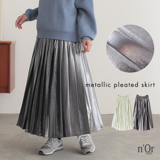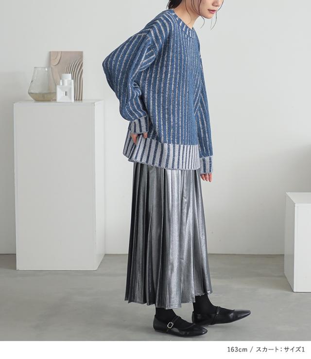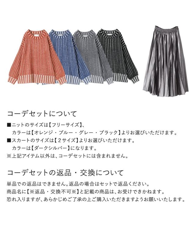 【送料無料】『二重臼配色リブ編みニット×メタリックプリーツスカートコーデ2点SET』【メール便不可】【50】[2点コーデセット 2025 レディース ニット トップス セーター スカート ロングスカートプリーツスカート]