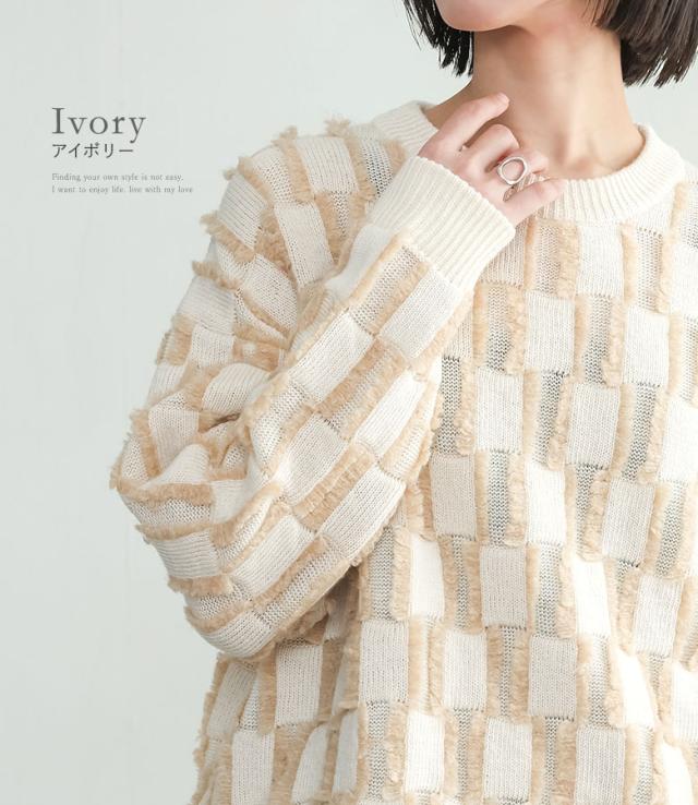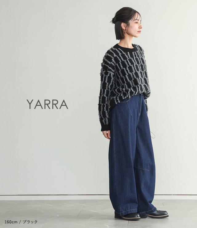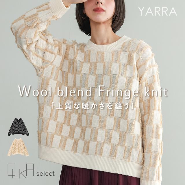 <冬新作>【送料無料】【メール便不可】【20】ニット レディース トップス セーター 長袖 春 秋 冬 クルーネック フリンジ ウール 配色 バイカラー 透かし編み ショート丈 リブ あったか YARRA ヤラ OUKA オウカ