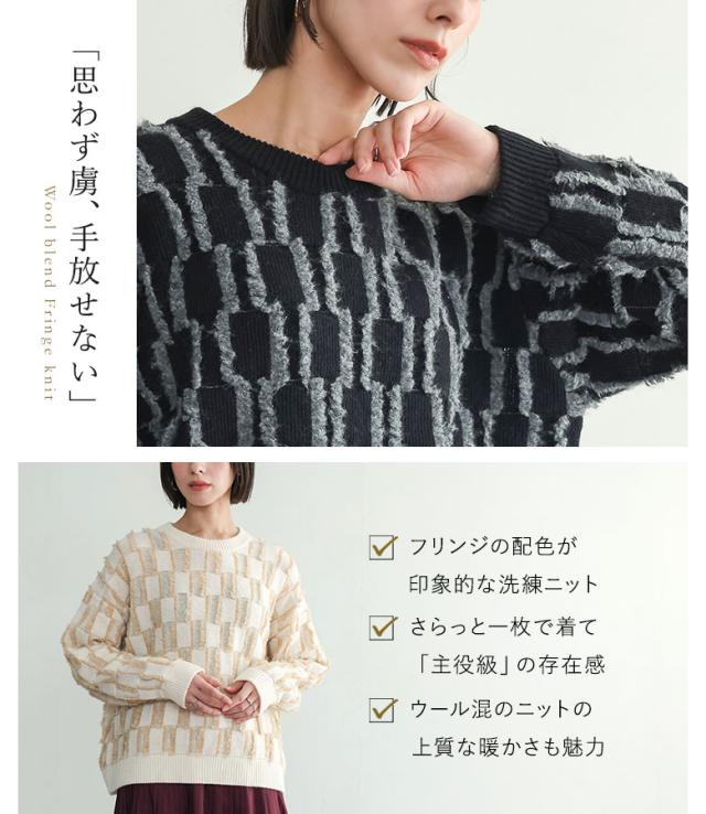 レディース 女性 大人 大人め 上品 30代 40代 50代 60代 ニット トップス 長袖 春 秋 冬 クルーネック フリンジ ウール 配色 バイカラー 透かし編み ショート丈 リブ あったか YARRA ヤラ OUKA オウカ ニット・セーター セーター SELECT オウカセレクト おうかせれくと Iライン Hライン 無地 透け感 カジュアル エレガント フェミニン キレカジ クラシカル レトロ セレカジ モード 可愛い系 大人女子 大人可愛い お洒落可愛い 大人カジュアル オフィスカジュアル きれいめ ニュアンス ラフ かっこいい 女子会 オフィス 通勤 通学 お買い物 お出掛け 旅行 おしゃれ お洒落 トレンド 流行 ママ 母 母親 【TP】 Sサイズ Mサイズ Lサイズ LLサイズ フリーサイズ ぽっちゃり 体型カバー 大きいサイズ プラスサイズ 低身長 高身長 ベージュ ライトベージュ ナチュラルベージュ ブラック 黒 ホワイト 白 オフホワイト アイボリー グレー 灰色[ID]34to0bv