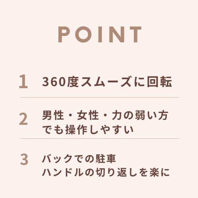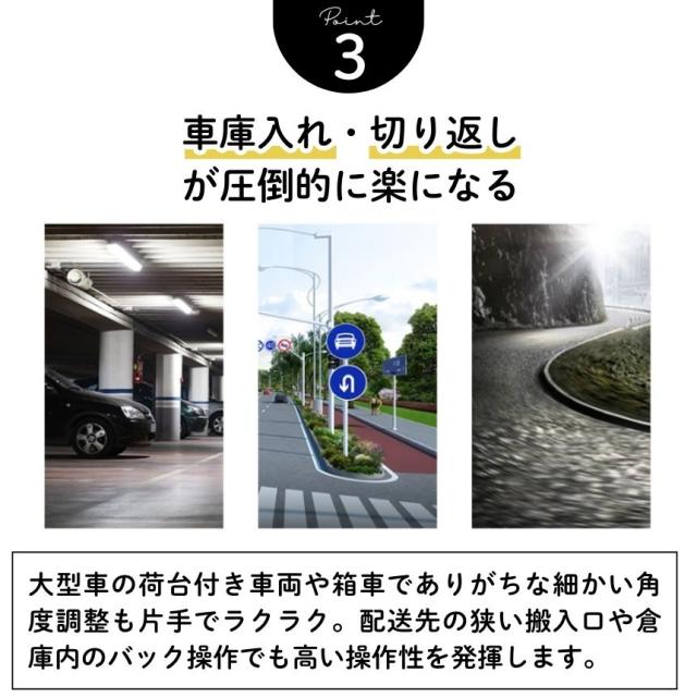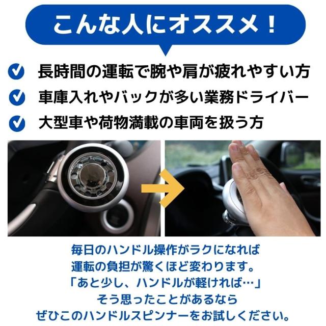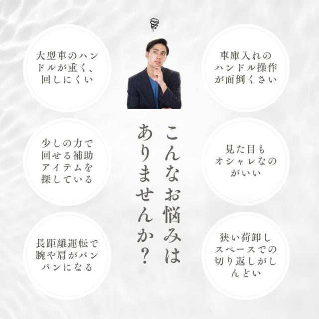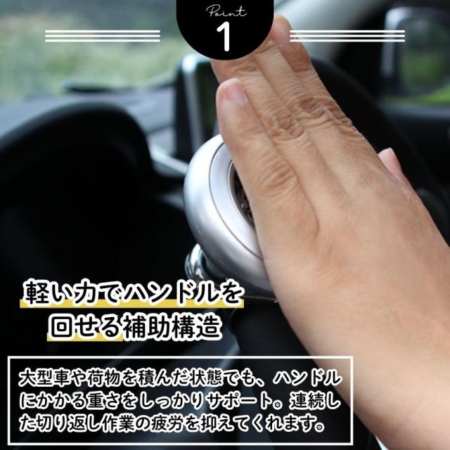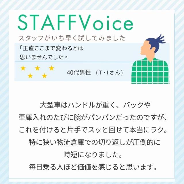 バックでの駐車、ハンドルの切り返しを楽に。 女性の力では回しにくいハンドルも軽い力で回すことができます!