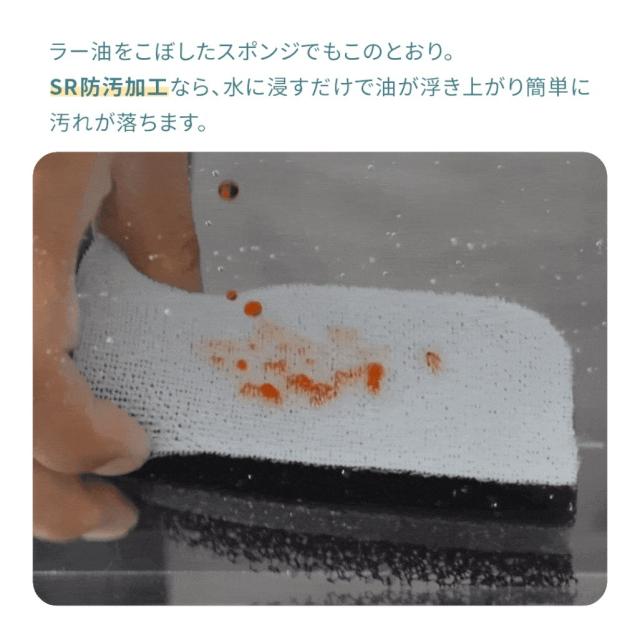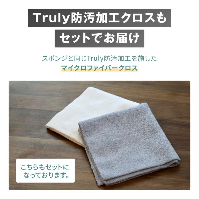 スポンジやクロスに施された「Truly防汚加工」により、油汚れやカレー・コーヒーなどの汚れを弾き、使用後は水でサッと流すだけで元の綺麗な状態に戻ります。
