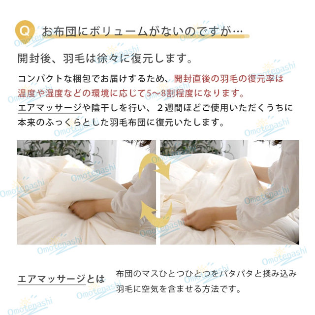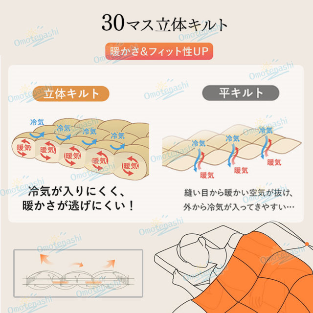 中わたのふんわり感を最大限に活かし、驚くような軽やかさを実現しました。