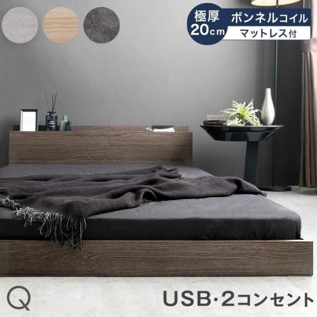 ベッド マットレス付き クイーン 2口コンセント付き宮棚 ローベッド マットレス付き クイーンベッド フレーム フロアベッド ボンネルコイルマットレス 木製 マットレスセット ベッドフレーム ベットフレーム