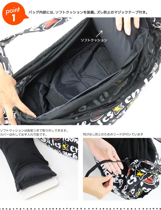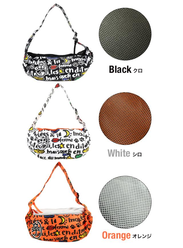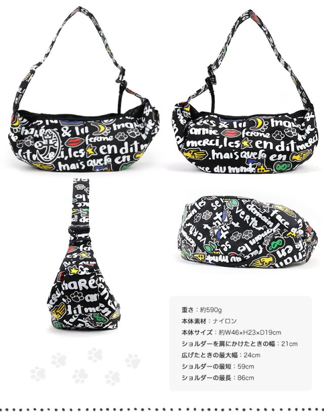 | SPEC | 重 さ:約590g 耐重量:6kg 素 材:ナイロン 付属:ソフトクッション、とび出し防止リード 本体サイズ:約W46×H23×D19cm ショルダーを肩にかけた時の幅:21cm 広げた時の最大幅:24cm ショルダーベルト: 約59cm(最短)〜86cm(最長) 収納:オープンポケット×1(外側) |