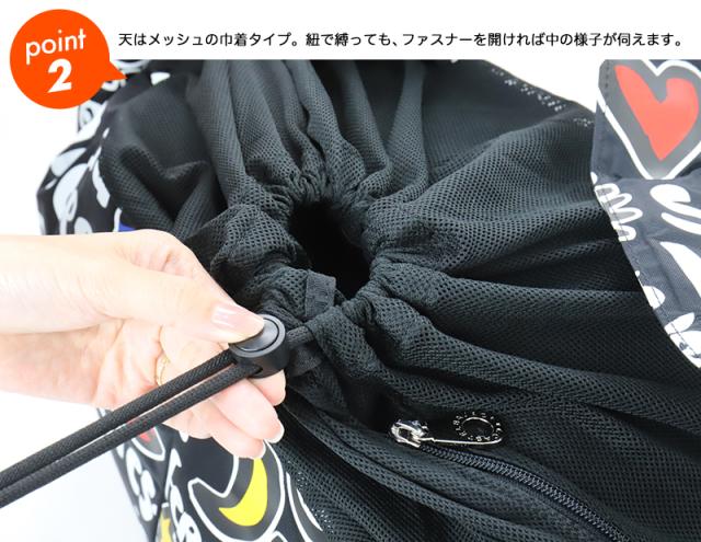 巾着を絞ってもサイドのファスナーを開くことで中の様子が伺えます♪