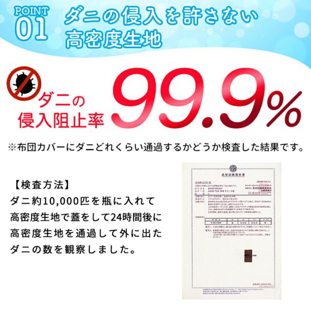 ・ダニの侵入を許さない高密度生地と3重縫製“トリプルステッチ” ダニの侵入阻止率99.9%。布団カバーにダニがどれくらい通過するかを検査した結果です。ダニ約10,000匹を瓶に入れて高密度生地で蓋をし、24時間後に高密度生地を通過して外に出たダニの数を観察しました。 ・アレルガードシリーズの高密度生地繊維の隙間が小さいため、ホコリ・ダニ・花粉を内部に侵入させずお布団を守ります。お洗濯や手で払うだけで除去できる高密度な生地です。 ・超極細糸の打ち込み本数による高密度生地一般的な布団カバーが30番手の136本打ち込みが多いのに対し、アレルガードは45番手の246本打ち込みで高密度な仕上がりを実現しています。 ・肌触りは、シルクのような滑らかでさらさらタッチ高密度生地ながら速乾性があり、さらさらとした心地よい触り心地を実現します。 ・裏面全周ゴム入りカバー裏側が、全周ゴムなので取り付けもカンタン。マットレス全てを覆えるので、側面からのダニの侵入を防ぎます。 |