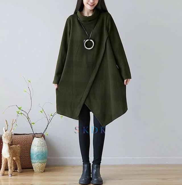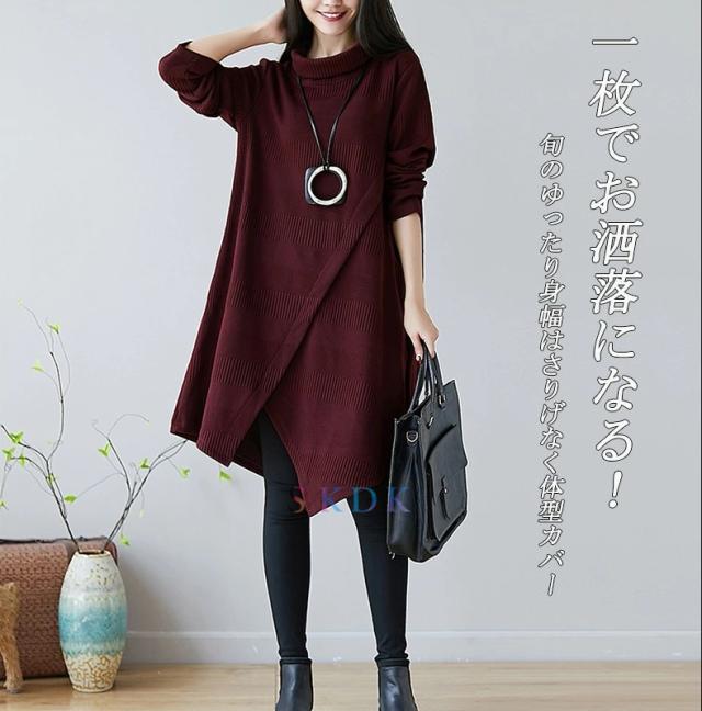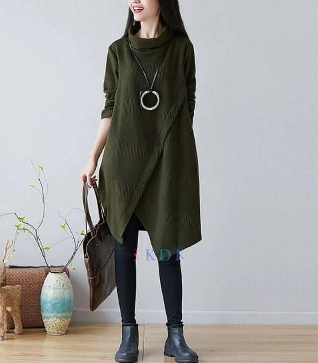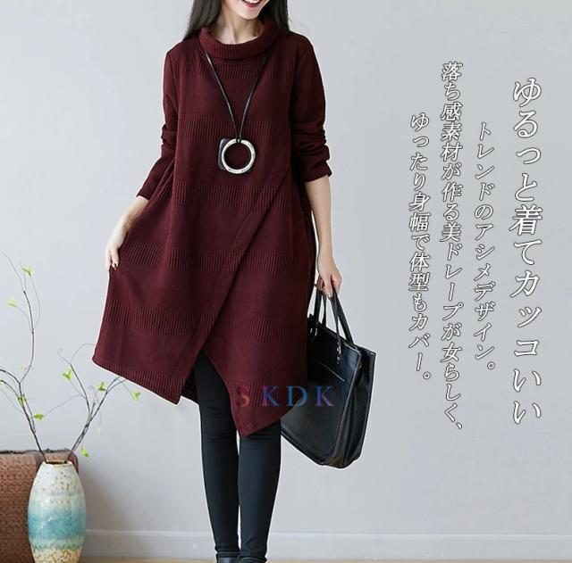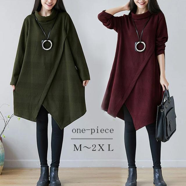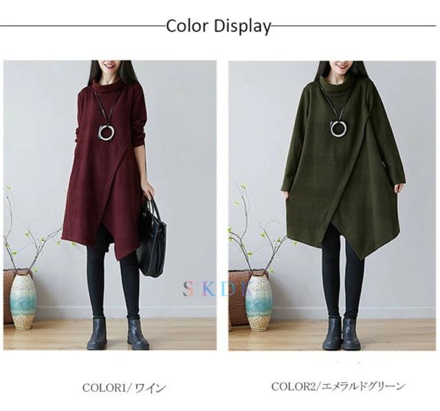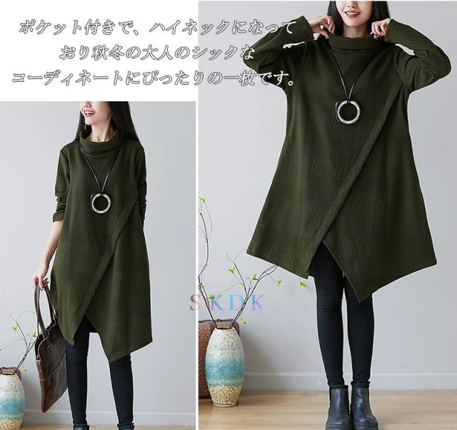 チュニック ワンピース レディース 長袖チュニック 秋冬 膝丈ワンピース ハイネックワンピース 厚手 長袖 ゆったり ロングワンピ ロング丈 プルオーバー 体型カバー Aライン 秋 冬 着痩せ 無地 不規則 大きいサイズ 送料無料