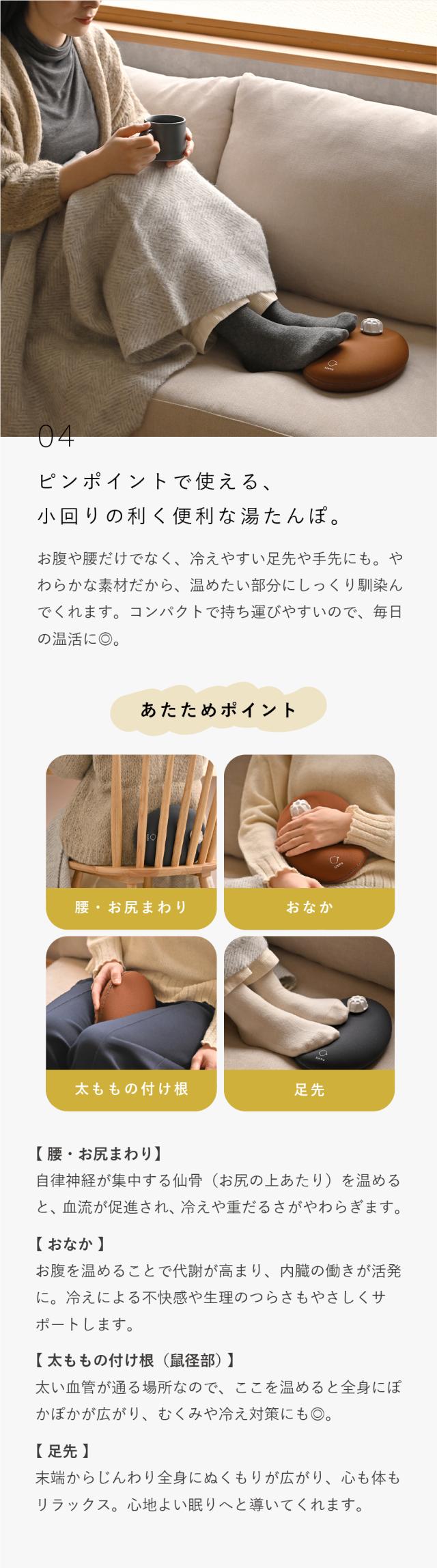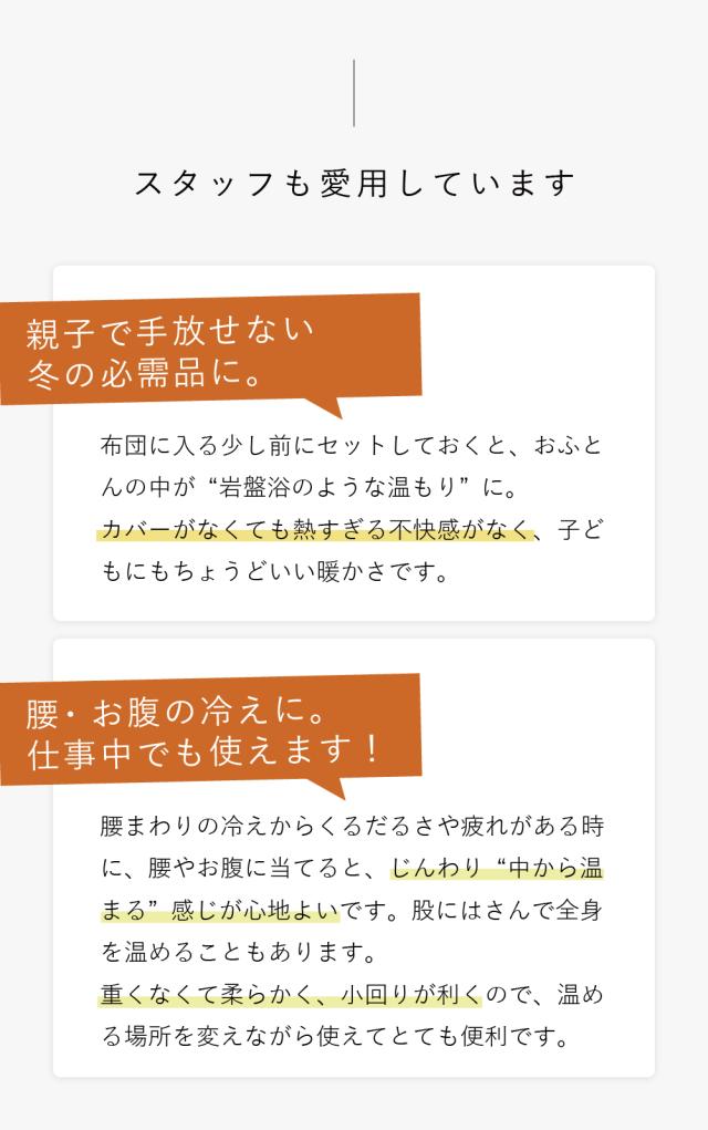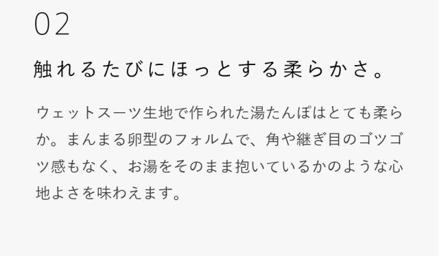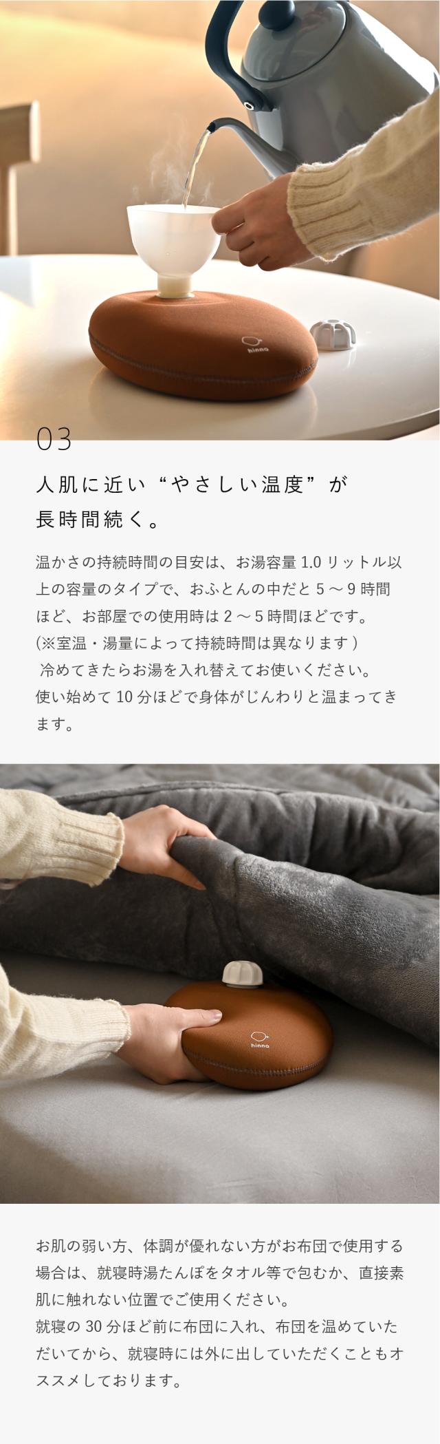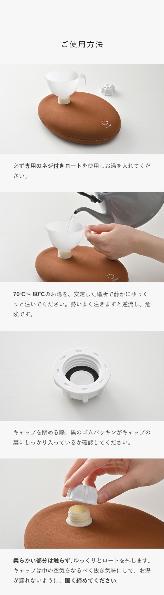【使用上のご注意】 <お湯を入れるとき>平らなところに湯たんぽを置くか箱などに入れ、安定した状態でお湯を入れて下さい。 <入れるお湯の温度>耐熱温度は100℃です。熱湯を注いでも、製品に問題はございませんが、安全のため、沸騰したお湯は、70〜80℃に少し冷ましてから、付属の「ネジ付きロート」を使用して入れて下さい。お湯を入れる際は、手や体にお湯がかからないようにご注意下さい。 <お湯を入れ終わったら> キャップは、特に意識して、きゅっ!と固く確実に閉めて下さい。締めが緩いとキャップが緩み、布団などを濡らす恐れがあります。しっかり閉まっている事を充分にご確認の上、ご使用下さい。キャップの裏側のゴムパッキンがお湯漏れを防ぎます。パッキンは外れる場合がありますので、ご使用になる前に必ずパッキンがついていることをご確認の上、キャップをお閉め下さい。 <持ち運ぶ時> キャップ部分を持って持ち運びをしないで下さい。特に、お湯を入れた状態でキャップ部分を持つと、重さで注ぎ口が剥がれやすくなり、不良の原因になります。 <クロロプレン素材について>湯たんぽは、素材のクロロプレンゴム特有のにおいがあります。使い始めはおふとんににおいがうつることがあるので、お手数ですが、ご使用前に薄めた中性洗剤やボディソープなどで手洗いしてからお使い頂くことをお勧めします。また、つくりたては接着剤のにおいが強く残っておりますが、製品自体に問題はございません。使用していく内にだんだんと強いにおいが薄くなっていきます。手洗いを行ったり、外干しをしたり、消臭スプレーを使用するなどでより早くにおいが薄まります。万一かゆみやかぶれの症状が出た場合や、匂いに敏感な方はご使用をお控え下さい。 <お取り扱いについて>・湯たんぽを投げたり、高所から落としたり、折り曲げたりしないで下さい。・鋭利なものや突起物などで、湯たんぽを刺したり、傷つけたりしないで下さい。・火のそばに置いたり、直接火にかけたり、電子レンジ等で温めたりしないで下さい。・また直射日光の当たる場所に放置しないで下さい。・使用後のお湯は、飲まないで下さい。・子どもが使用する際は、保護者の目の届くところで使用して下さい。 ・基本的に体重をかけるような構造にはなっていません。湯たんぽの上に乗ったり、座ったりして体重をかけないで下さい。また、枕として使用しないで下さい。 <保管方法>保管の際はキャップを開け、本体を振るなどして中の水分を極力飛ばしきり、しばらくキャップを開けたままにして放置し、なるべく乾かした後、直射日光が当たらない場所で保管して下さい。またその際、折り曲げて放置しないで下さい。折り傷の原因になります。中は完全には乾きにくいですが、カビなどは発生しにくいです。次回お使い頂く時に、熱いお湯を一度入れてからお使い頂くと熱湯消毒になります。時間の経過と共に、多少ゴムが劣化して縮むことがあります。劣化の具合は、使用頻度やお住まいの地域の水質などにより異なります。処分する場合は、市町村の区分に従って下さい。