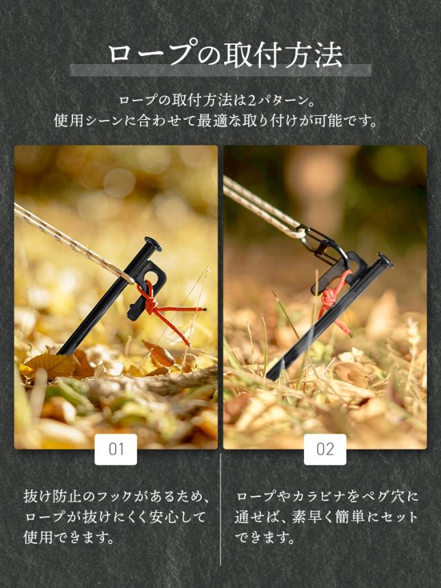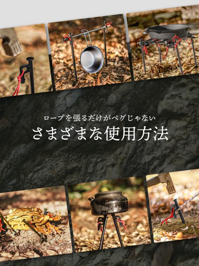 キャンプ、アウトドア、タープ固定、テント設営など、あらゆるシーンで活躍する頼れるペグセットです。