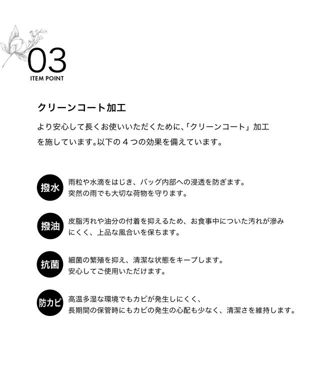 より安心して長くお使いいただくために、「クリーンコート」加工(撥水・撥油・抗菌・防カビ)を採用。いつまでもきれいな状態で長くご使用いただけます