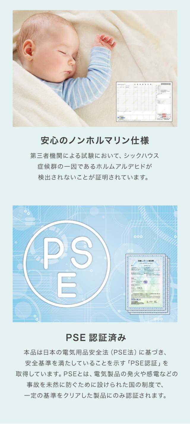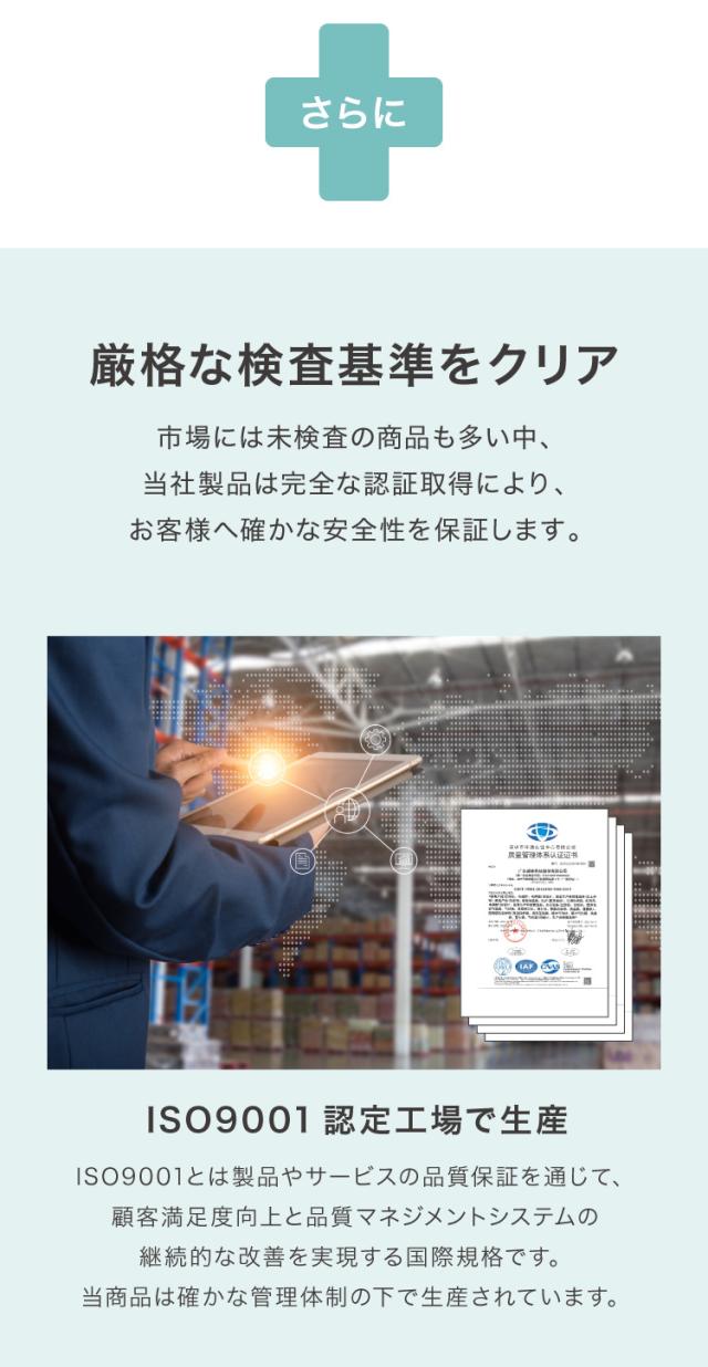 ・安心の各種認証取得:ISO9001認証・ホルムアルデヒド不使用証明・抗菌消臭認証を取得済み。