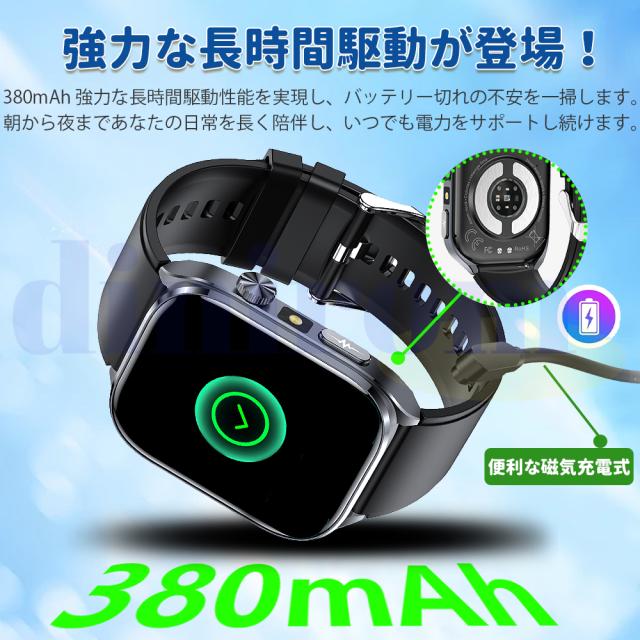 長い持ちの380mAhバッテリー搭載され、一回フル充電、機能全開の場合は、2-4日ほど持ちます。一部の機能がオンになっている場合、5~7日間の連続使用も問題なく、待機時間は最大約20日間です。頻繁に充電する手間が省けます。通知やBluebooth通話などの基本的なスマートウォッチ機能に加え、例えば、ストップウォッチ、カウントダウン、歩数計、カロリー、距離、睡眠監視、音声アシスタント、携帯検索、天気予報、音楽コントロール、名刺、電卓、カレンダー、多言語、遠隔カメラ、目覚まし時計、SOSなど、日常生活をより快適にする機能が搭載されています。ios13.0以上、android8.0以上のスマホに対応可能、さまざまシーンで使用できます。