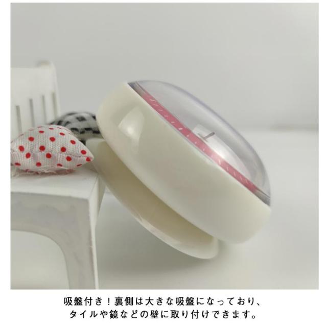 | 防水・防滴 バスクロック。吸盤式の壁掛け時計で、浴室の壁に簡単に取り付け可能です。吸盤式のかわいい防水時計(バスクロック) 防水仕様!お風呂や洗面所、キッチンなどの水回りに設置できます。バスルーム・洗面所・キッチンなど、水のかかる場所で使える防水設計。防水保護等級IPX3 濡れても時間を確認しやすいかわいいデザインの文字盤です。 吸盤付き!裏側は大きな吸盤になっており、タイルや鏡などの壁に取り付けできます。 | |