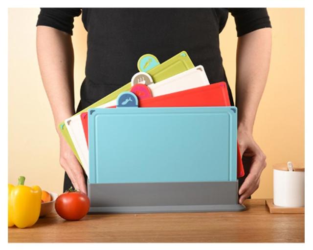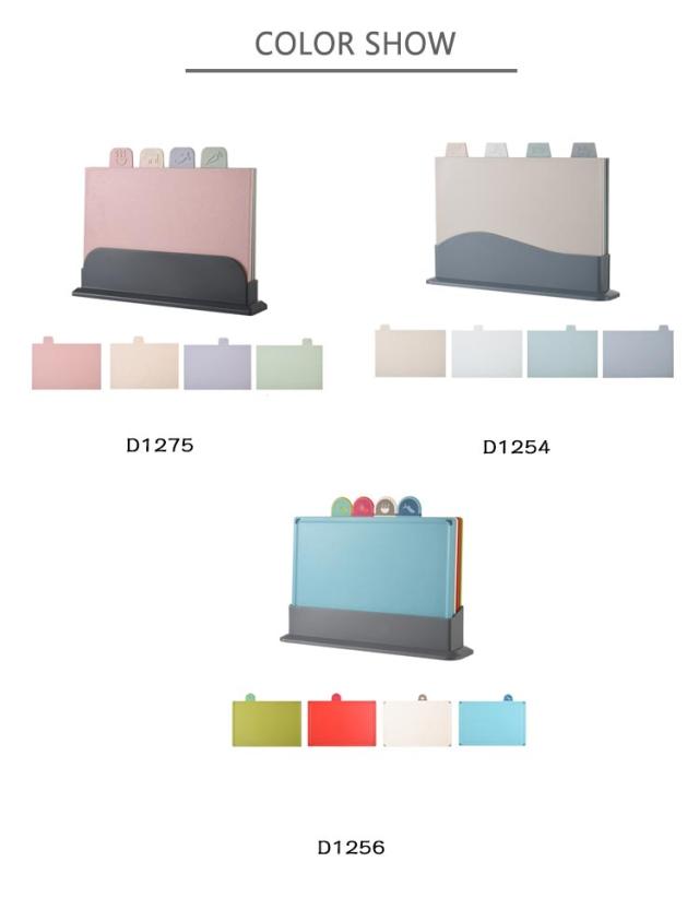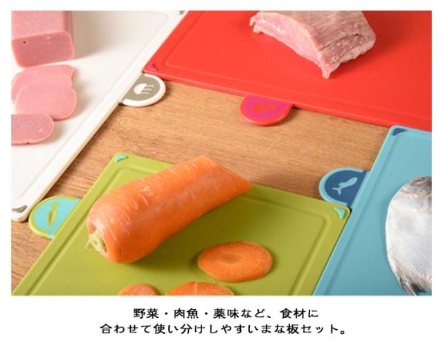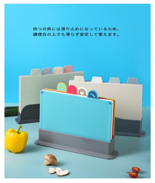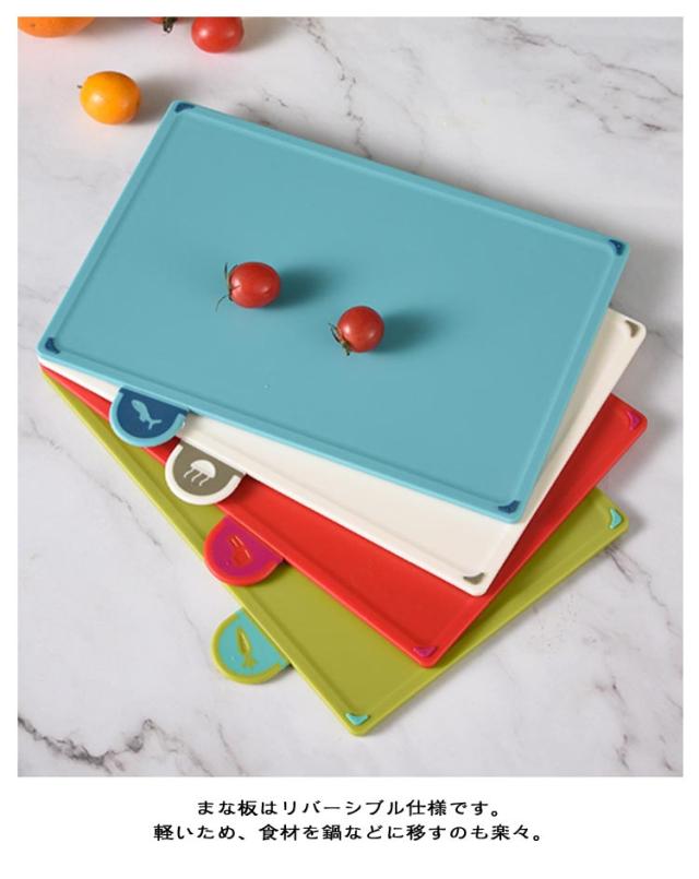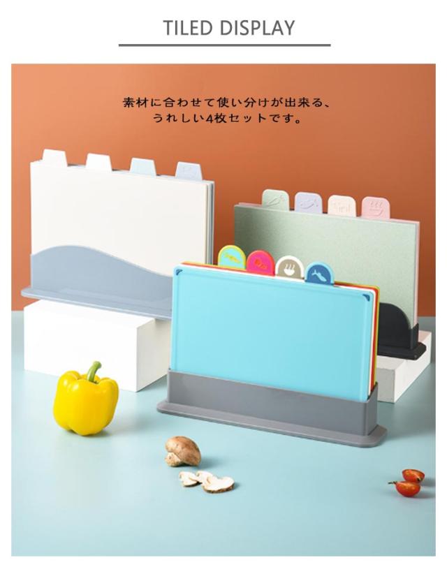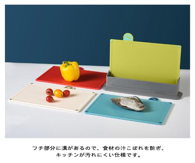 | まな板 4枚セット 【スタンド付き】 素材に合わせて使い分けが出来る、うれしい4枚セットです。 野菜・肉魚・薬味など、食材に合わせて使い分けしやすいまな板セット。 フチ部分に溝があるので、食材の汁こぼれを防ぎ、キッチンが汚れにくい仕様です。 四つの角には滑り止めになっているため、調理台の上でも滑らず安定して使えます。 まな板はリバーシブル仕様です。 軽いため、食材を鍋などに移すのも楽々。 | |