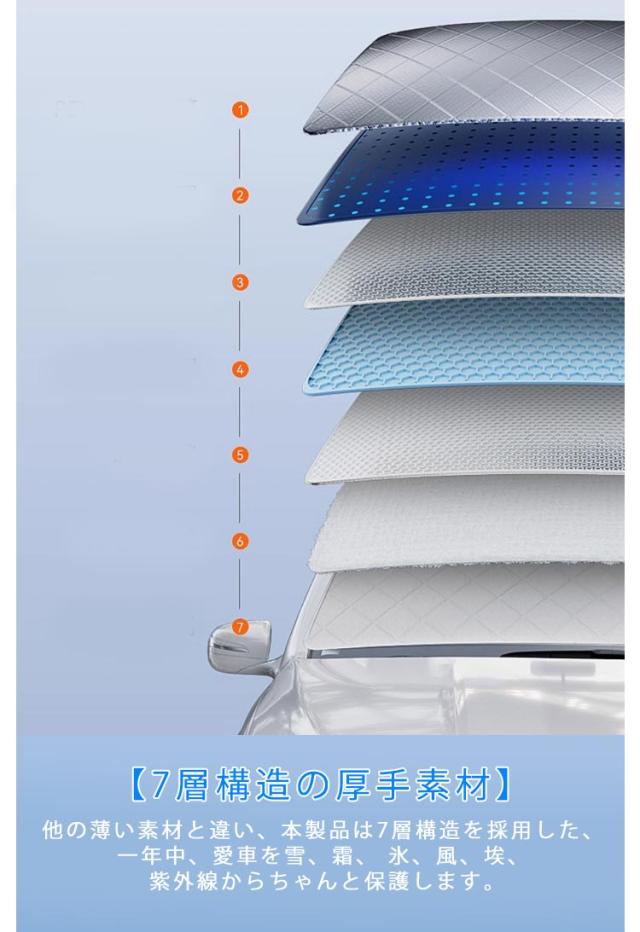 | 車凍結防止!カーフロントカバー 【7層構造の厚手素材】他の薄い素材と違い、本製品は7層構造を採用した、一年中、愛車を雪、霜、 氷、風、埃、紫外線からちゃんと保護します。 【全面保護】大面積の設計で、エンジンカバー・助手席側窓ガラス・フロントウィンドウ・ 運転席側窓ガラス・リアビューミラーを全面保護できます。 【安全反射シート】夜間の事故を防止するために、バックミラーの前に反射帯がついております。 夜間の安全性を高めます。 | |