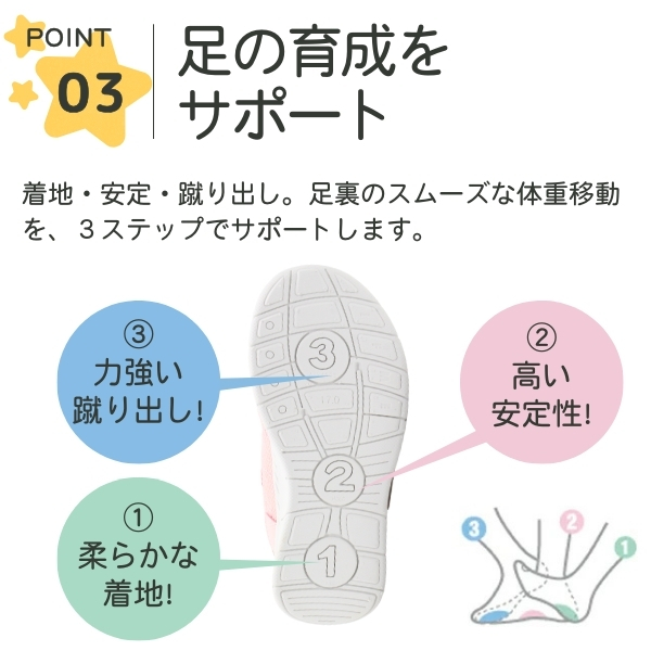 着地・安定・蹴り出し。足裏のスムーズな体重移動を、3ステップでサポートします。