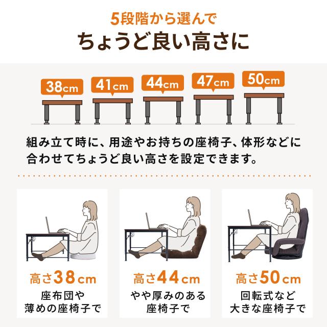●横幅100cm、奥行60cmのシンプルなローデスクです。●高さ調整は約38cm、約41cm、約44cm、約47cm、約50cmの5段階で調整できます。