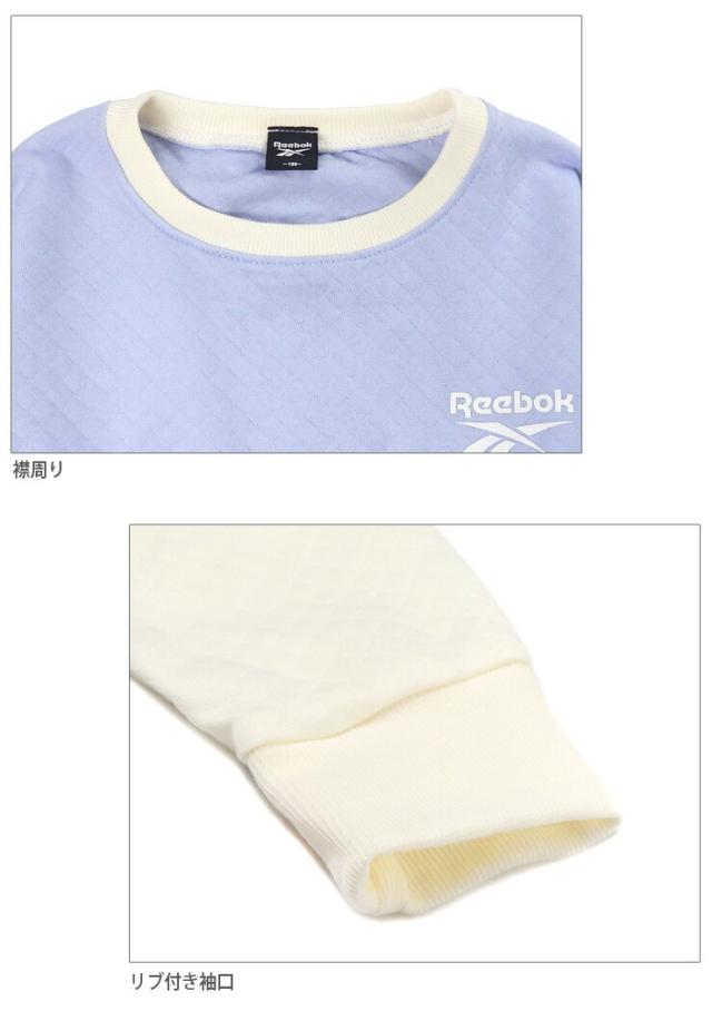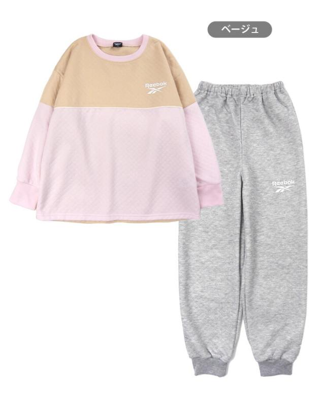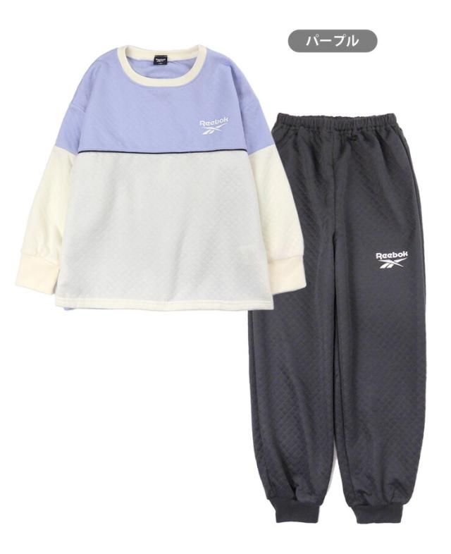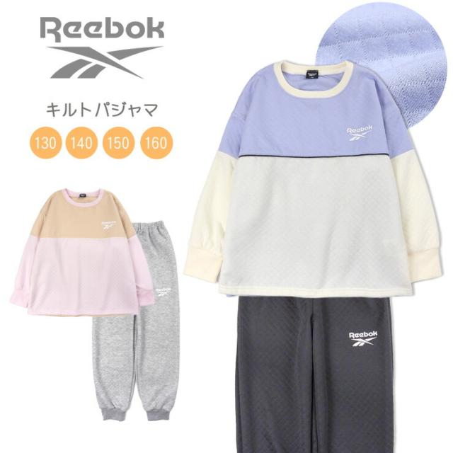 リーボック 長袖 キルト パジャマ 上下セット キッズ ジュニア 女の子 秋春 130 140 150 160 76356HH パープル ベージュ Reebok ルームウェア クルーネック 丸首 Uネック 長ズボン ロングパンツ キルティング リブ ホワイト ピンク ブラック グレー 紫 茶 送料無料 kj0100