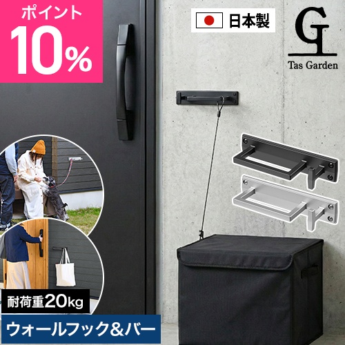 掛ける、吊るす、置く、つなぐ、立てかける。ウォールフック&バーは、アイデア次第で使い方が広がるマルチフック。玄関に設置すれば、買い物袋の一時掛け、長傘や折り畳み傘の傘置き、ワイヤーロックを通せば宅配BOXや自転車の盗難防止に活躍します。またバー10kg、フック10kgの耐荷重があり安心。