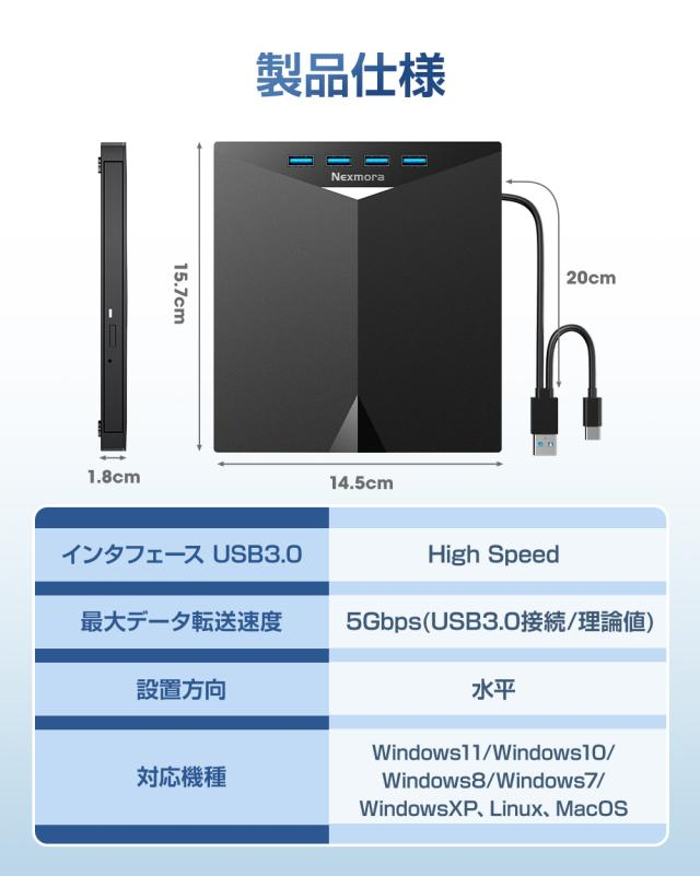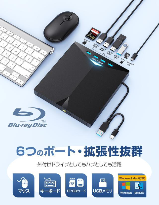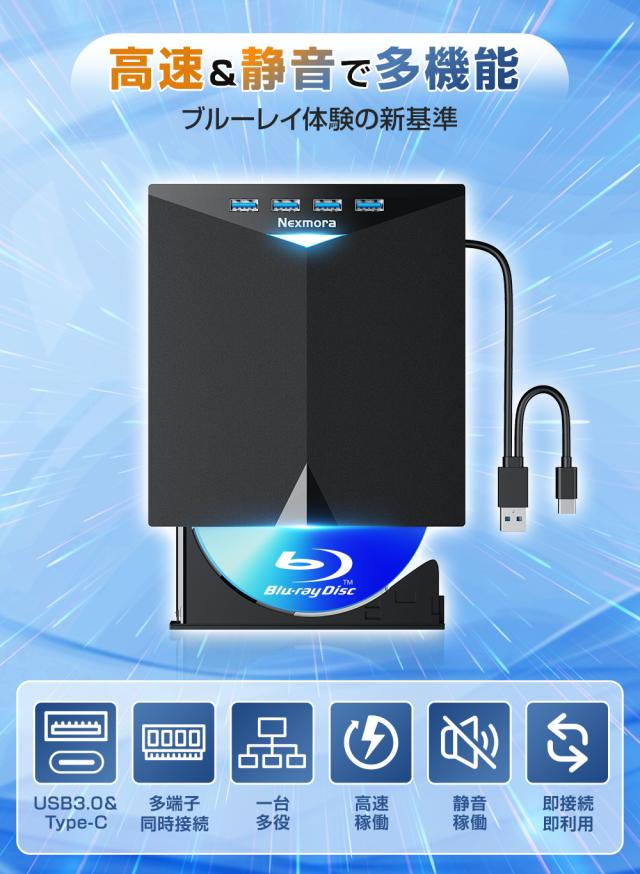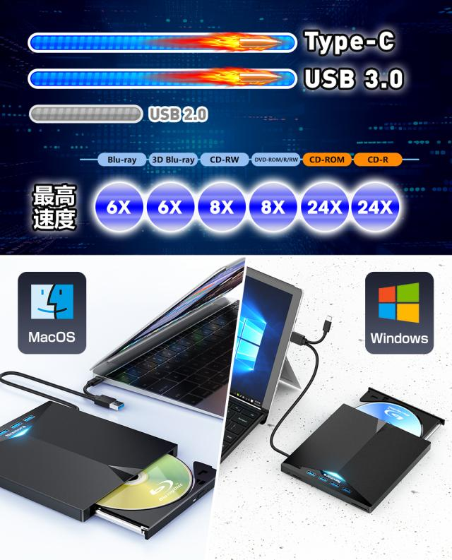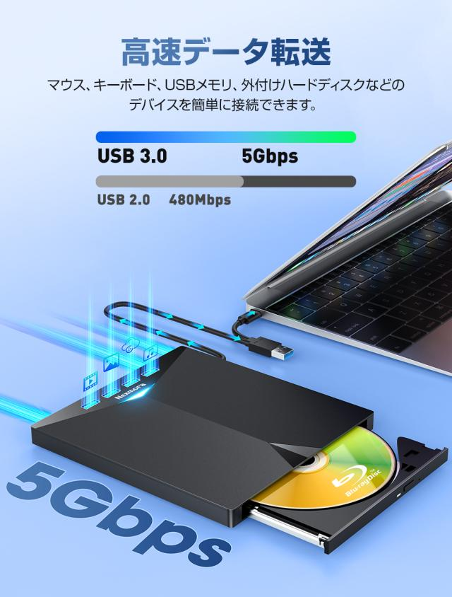 ブルーレイドライブ DVDドライブ CD/DVDプレイヤー CD/DVD読取/書込 静音 高速 軽量 コンパクト 外付け ケーブル内蔵 usb3.0 CD/DVDドライブ ポータブルドライブ