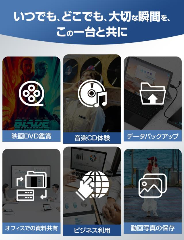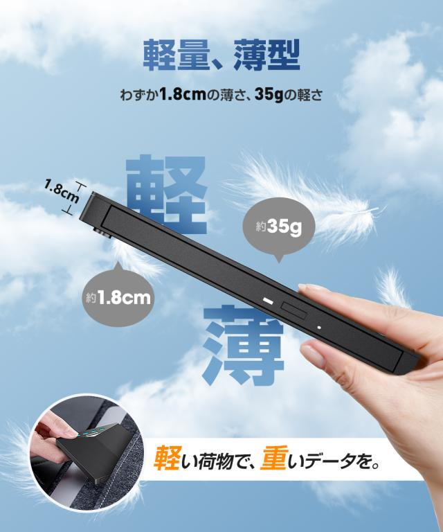 Blu-ray、CD/DVD-ROM、CD-R/RW、DVD±R/RWなど、安定した読み書き性能を提供。