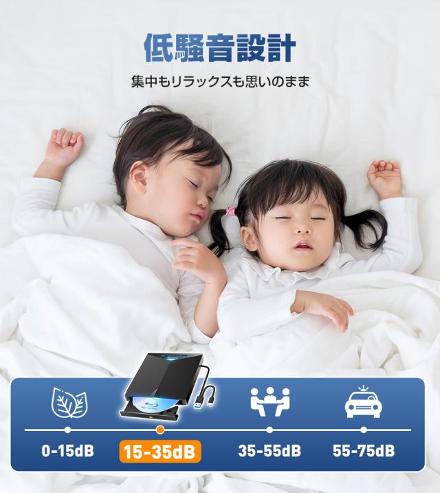 最大6倍速Blu-ray、8倍速DVD、24倍速CDの読み書きを実現。高速かつ安定した動作で、作業や映画鑑賞も快適。静音設計により、使用中の動作音を最小限に抑え、集中できる外付けブルーレイドライブです。