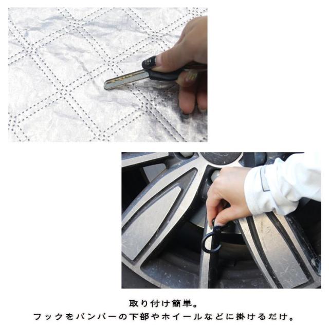 | フロントガラスとサイドミラーをガード! 軽自動車、セダン、ワゴン、ミニバンなど様々なお車に使用可能。 取り付け簡単。フックをバンパーの下部やホイールなどに掛けるだけ。 サイドミラーも被せることができ、しっかり固定でき、風でシートが飛ばされにくい。 カバーの表面はアルミ素材で、日差しを反射する効果があります。また、撥水加工が施されていて、水切れが良く、防水機能付きです。 冬は雪・霜によるフロントガラスの凍結を防止。春から秋は黄砂、花粉、ほこり、鳥の糞、直射日光から車体を保護。 1年中使えて取り付け取り外しの簡単なボディーカバーです。 | |