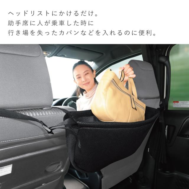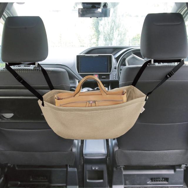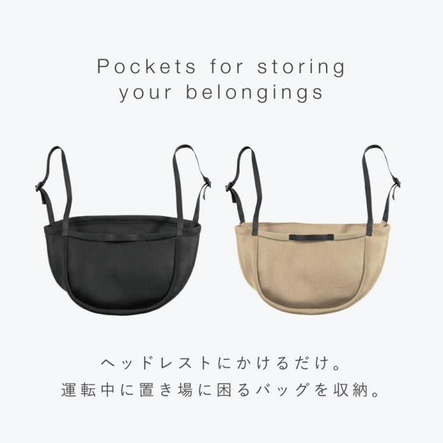 ヘッドレストにひっかけるだけの簡単取付。運転中に置き場に困るバッグを収納できるポケット。