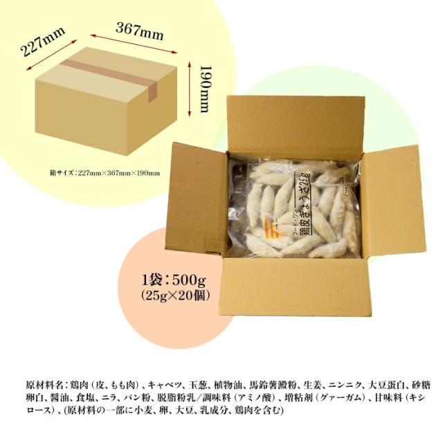 鶏肉(皮、もも肉)、キャベツ、玉葱、植物油、馬鈴薯澱粉、生姜、ニンニク、大豆蛋白、砂糖、卵白、醤油、食塩、ニラ、パン粉、脱脂粉乳/