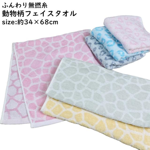 フェイスタオル 無撚糸 約34×68cm 動物柄 ヒョウ キリン ジラフ 綿100% タオル 吸水 スタンダード 普段使い シンプル コットン 新生活 買い替え やわらか ふわふわ おしゃれ