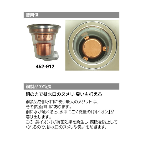 銅イオンの働きで、ヌメリ・臭いを抑える。 ■メーカー:カクダイ ■品番:452-912 ■材質:銅 ■ヌメリが付きにくい銅製 ■4520S、4520W、452-502、452-522、452-601、452-602、452-621、452-622用 ※記載は商品仕様の一部です。仕様説明不足等の理由での返品はできません。特に適合等は必ずご確認ください。