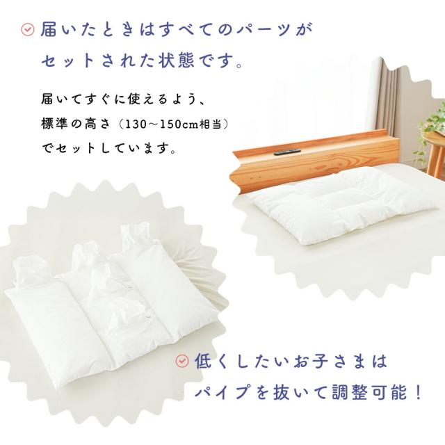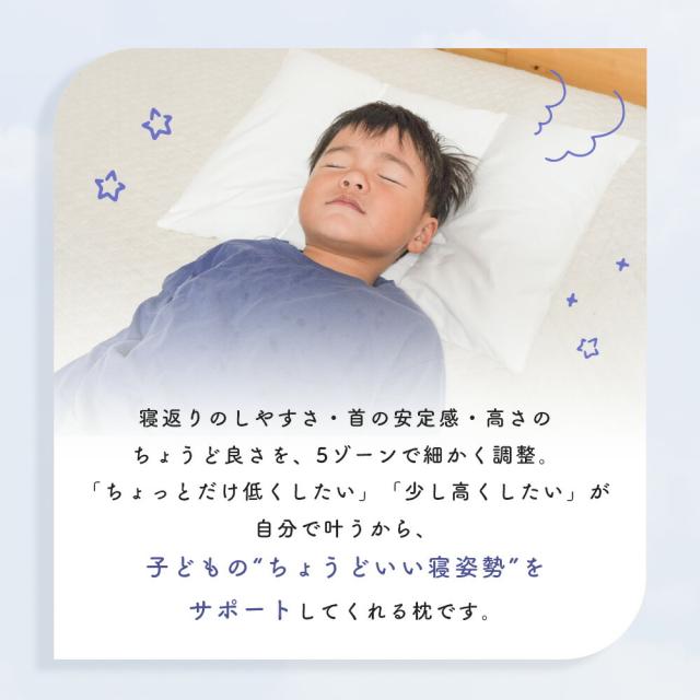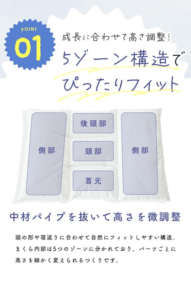 ・成長に合わせて高さ調整!5ゾーン構造でぴったりフィット 頭の形や寝返りに合わせて自然にフィットしやすい構造。まくら内部は5つのゾーンに分かれており、パーツごとに高さを細かく変えられるつくりです。 ・届いたときはすべてのパーツがセットされた状態です。届いてすぐに使えるよう、標準の高さ(130?150cm相当)でセットしています。 ・低くしたいお子さまはパイプを抜いて調整可能!パイプを抜くことで高さ調整ができ、お子さまの好みに合わせて快適にお使いいただけます。 ・選べるピローケース付き!お気に入りカラーで寝る時間をもっと楽しく届いたその日から使える、色が選べる枕カバーセット。子どもの“好き!”を選べるから、おやすみ前の時間がもっと楽しみに。 ・清潔に使える!手洗いOKでいつでも爽やかまくら本体は手洗いOK!カバーは洗濯機で洗えるので、毎日サラッと清潔にお使いいただけます。 |